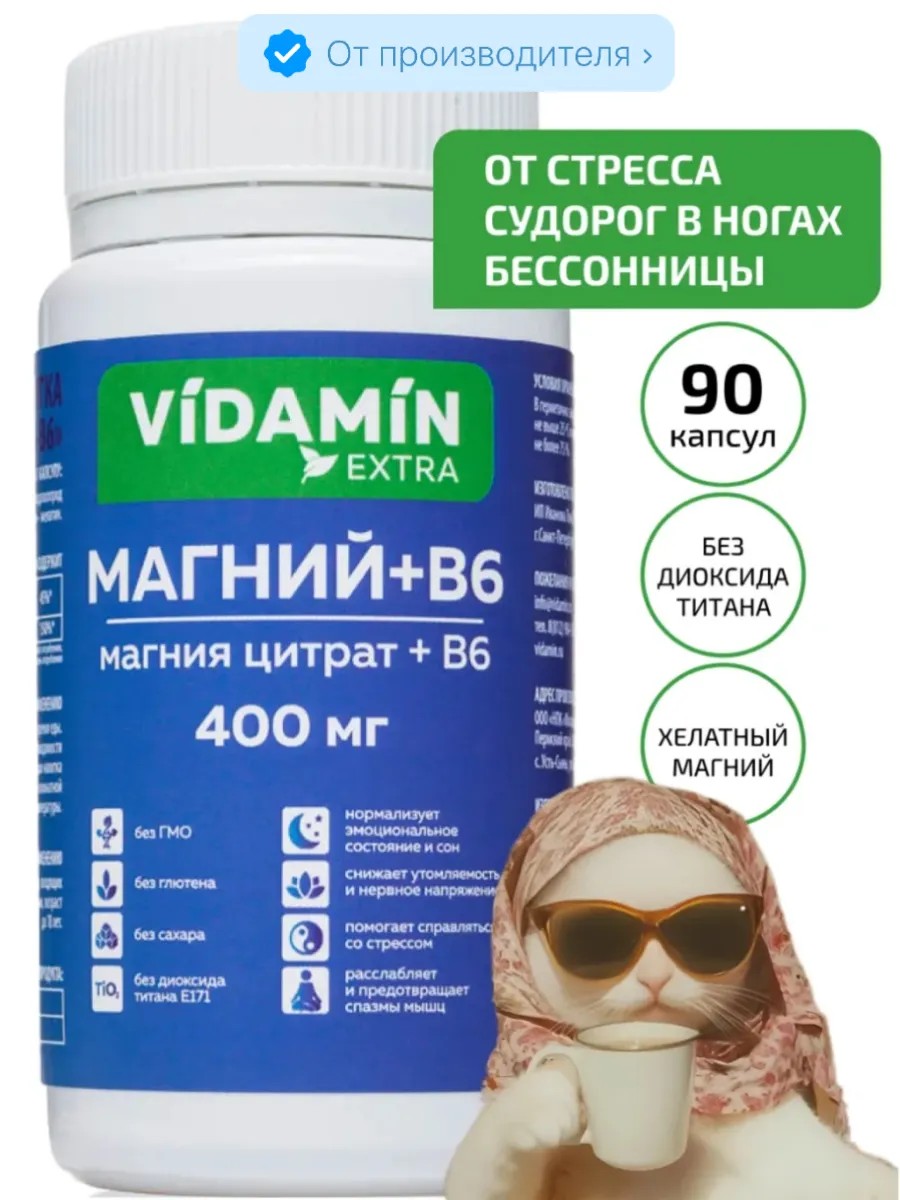 Магний VIDAMIN EXTRA - органический витаминный комплекс с высокой усвояемостью, содержащий цитрат магния и витамин В6. Этот препарат улучшает устойчивость к стрессу, депрессии, улучшает работу сердца, мышц, обменные процессы, сон и устраняет усталость. Рекомендуется для взрослых всех возрастов, особенно при стрессе и физической усталости. Безопасный и эффективный, подходит для регулярного использования, совмещения с другими средствами и детей. Принимать 1-3 капсулы в день во время еды. VIDAMIN EXTRA - ваш надежный помощник для поддержания здоровья и энергии. Магний VIDAMIN EXTRA - это не просто таблетка, это целый комплекс витаминов и минералов, необходимых для поддержания здоровья и активности. Этот препарат идеально подходит как для женщин, так и для мужчин, помогая справиться со стрессом, улучшить работу сердца и мышц, а также улучшить обменные процессы и качество сна. Магний б6 для женщин от стресса станет незаменимым помощником, помогая сохранить спокойствие и уверенность в себе даже в самые напряженные моменты. Этот препарат поможет вам оставаться в гармонии с собой и окружающим миром, несмотря на все трудности и испытания. Магний б6 для женщин также поможет поддержать здоровье и красоту, улучшая состояние кожи, волос и ногтей, а также общее самочувствие. Этот препарат станет вашим незаменимым помощником в борьбе за здоровье и красоту. Магний б6 для мужчин поможет поддержать физическую активность и выносливость, улучшить работу сердца и мышц, а также улучшить обменные процессы и качество сна. Этот препарат станет вашим надежным помощником в борьбе за здоровье и активность. Благодаря своему уникальному составу, эта таблетка станет незаменимым помощником в борьбе за здоровье и энергию.