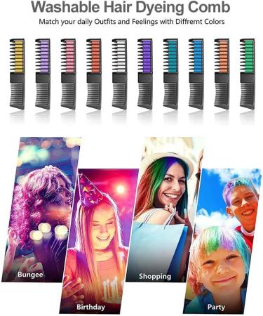 Features: ?Temporary Hair Chalks?--Comes in 10 vivid colors, You can use them individually or mix the colors. Various colors all blend into one another creating so many different looks. Make your hair as vibrant as you are. ?Fits Most Hair Color?--While our hair chalks work beautifully on all natural hair colors, be sure to choose the best look for you: blonde hair gives a brighter look and holds color longer, while darker hair suits the more vibrant colors in our range. ?Washable Instant Hair Chalk Pens?--Give a nice vibrant color to damp hair and is easy to wash off and doesn't cause any damage to the hair or skin if used both ways. ?Widely Application?--Suitable for kids, girls and boys, children ,teenagers, men and women adults of all ages 3+ to use on their hair. Even can be used on our pets or excellent face paints too. Made a Great Gift for kids, girls, boys, elders Tips: 1. Light-colored hair is easy to color, like gray and gold. 2. Dark hair is not easy to color, such as brown and black hair, you can spray more water, which will make it better to apply the color to the hair. 3. Hair chalk has a little stickiness. For more than 3 years of age, sensitive skin with caution. 4. Easy to clean, rinse off before going to bed to avoid soiling your pillowcase and clothing. Instructions: Step 1: Spray the hair you want to dye with water. Step 2: Straighten the hair you are going to dye first, then comb clockwise to dye. Step 3: After dyeing, you can use a comb or hair dryer to create your favorite hairstyle.?Removable & Reusable? With a unique plastic cover design, it can be recycled and stored. The crayon comb is also removable. After the dye is used up, you can buy a refill again to replace it. ?Easy to Use? Before using the hair chalk for kids, slightly spray a little water to wet your hair, then use the hair chalk to add streaks, spots and colors where you want, just use a quick blow dryer to lock in the color. ?Multipurpose? Hair color chalk comb changes the hair color in a few minutes, it's often used for party, cosplay, kids' birthday, Halloween, Christmas, friends gathering, children's campus activity or dog hair coloring, etc. Perfect for daily hair beauty, Festivals, Parties, Events, Clubbing, Raves, Easter, Halloween, Christmas, Fancy dress, etc. ?Non-Toxic Ingredients? The hair chalks for girls can be used for face painting at parties and role plays. These hair chalks are made of safe powder pigments with non-toxic ingredients, completely safe for hair and skin. Just wash it with ordinary shampoo and water. If you want the color to stay longer, you can choose to use it in wet hair. ?10 Color Hair Chalk for Kids ?Hair chalk set includes 10 bright colors-Red, Orange, Blue, Dark Purple, Yellow, Purple, Rose, Pink hair chalk kids are ready for your choice. 10 vibrant colors to make your hair as vibrant as you are. The hair chalk can help you express your different personalities and creativity.