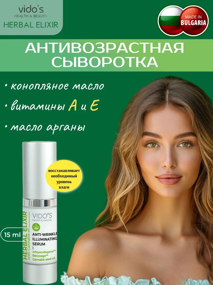 Помогает устранить морщины и тонкие линии и восстанавливает сияющий блеск и красоту вашей кожи. Ichtyocollagene повышает эластичность кожи, выравнивает и разглаживает структуру. Renovage помогает поддерживать молодость на клеточном уровне за счет увеличения размера теломер. Масло арганы и каннабиса эффективно питают и успокаивают, а витамины А и Е оживляют кожу и оказывают антиоксидантное действие. Сыворотка для лица VIDO'S health&beauty с конопляным маслом — это эффективный способ вернуть коже сияние и молодость. Формула, обогащенная конопляным маслом, интенсивно питает и увлажняет кожу, разглаживая морщины и повышая ее эластичность. Регулярное применение сыворотки способствует улучшению цвета лица, делая его более ровным и сияющим. Подходит для всех типов кожи.