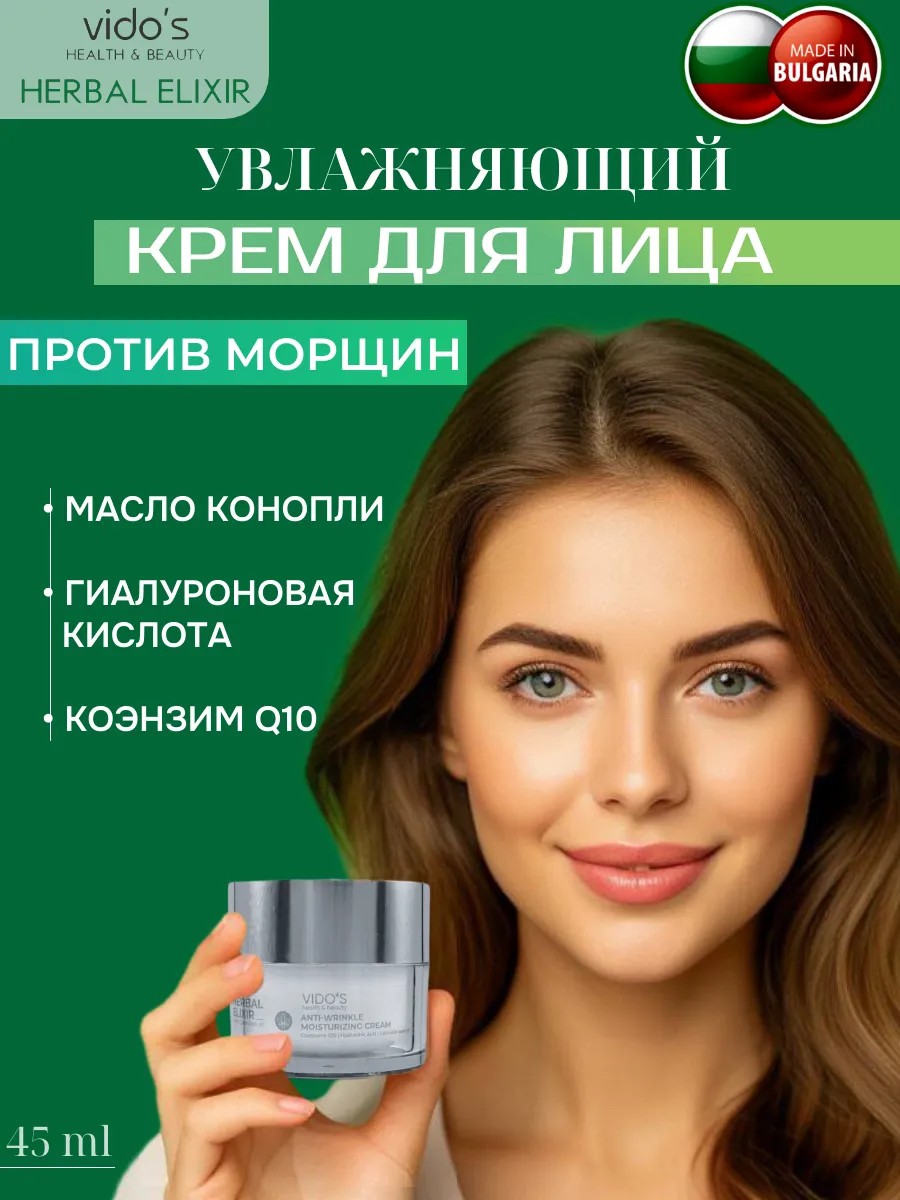 Увлажняющий омолаживающий крем против морщин с конопляным маслом от VIDO'S health&beauty — это универсальное решение для ежедневного ухода за кожей лица. Формула крема, обогащенная конопляным маслом, глубоко увлажняет, успокаивает и разглаживает кожу, уменьшая видимость морщин. Антивозрастной крем подходит для всех типов кожи в том числе: для сухой, комбинированной, чувствительной кожи лица.Благодаря своей легкой текстуре крем быстро впитывается, не оставляя жирного блеска, и может использоваться как днеаной или ночной уход, а также наносить под макияж. УВЛАЖНЯЮЩИЙ КРЕМ против МОРЩИН с маслом каннабиса для всех типов кожи. Коэнзим Q10 (Co Q10) активно стимулирует естественные клеточные функции кожи и помогает уменьшить морщины. Высокая концентрация гиалуроновой кислоты глубоко увлажняет и сохраняет влагу в течение длительного времени. Крем дарит сияющий цвет лица, молодость и здоровье коже. Производство не Корея.