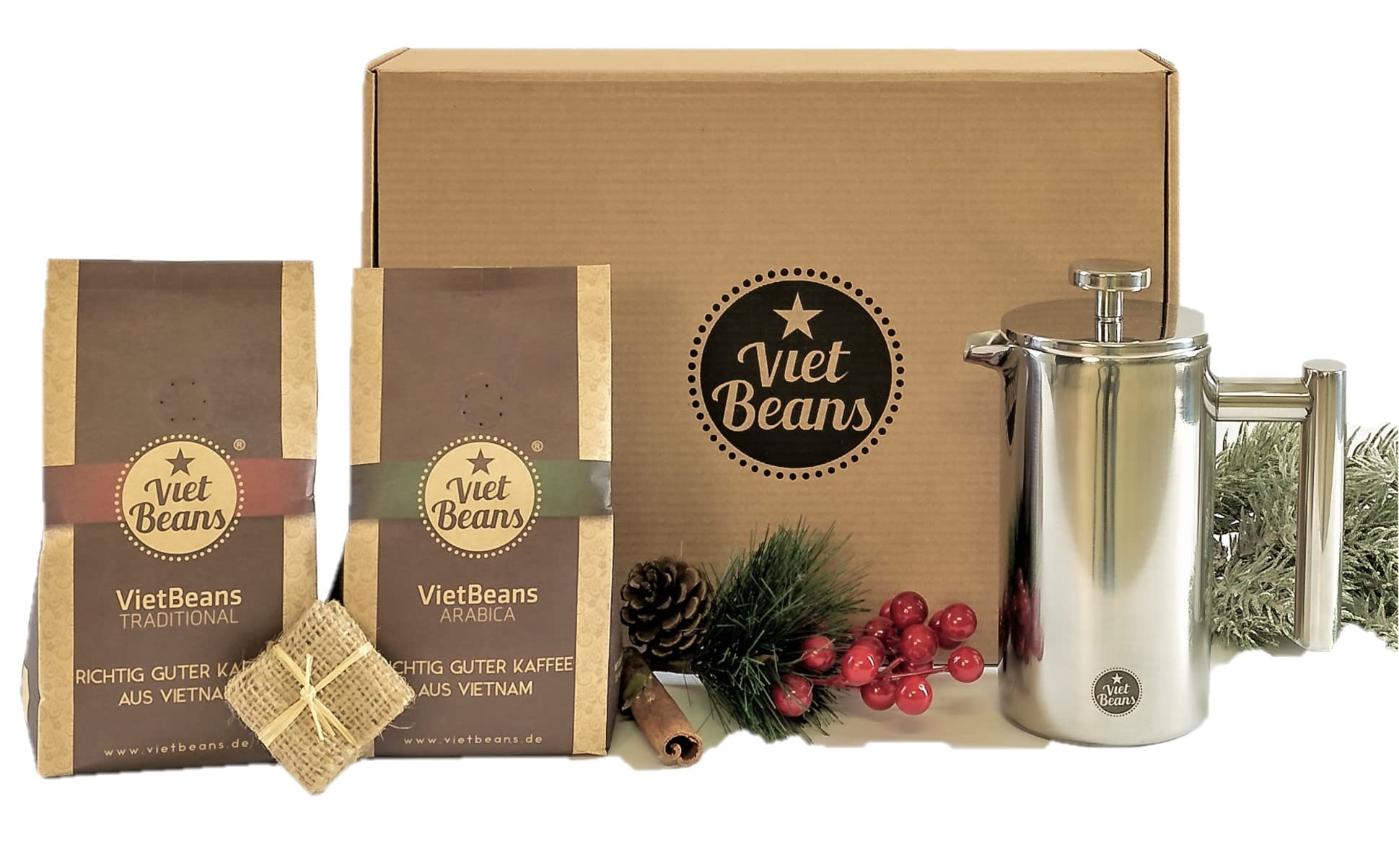 Kaffee Geschenk für Männer, Frauen oder die Schwiegereltern. Eine Kaffee Geschenkidee für jeden Kaffeetrinker. Kaffee Set Weihnachten für Genießer. Coffee gift christmas. Tolle Geschenkideen für Kaffeeliebhaber. Kaffee Probierset Bohne und manuelle Kaffeemaschine. Kaffee manuell zubereiten ohne Abfall. Keine zusätzlichen Filter notwendig. Kaffeebereiter Camping. Enthält 2 x 250g vietnamesischer Kaffee für French Press. Ganze Kaffeebohnen für ein kräftiges French Press Kaffeepulver mit schokoladigen und nussigen Aromen. Ein Kaffee Probierset ganze Bohne. Inklusive French Press 1 Tasse, auch Drückkanne, Frenchpresser, Press Stempelkanne oder Kaffeedrücker, aus poliertem doppelwandigen Edelstahl. Extrem robust und hält Getränke länger warm. Das VietBeans Kaffee Set enthält eine French Press 0,35 l und zwei hochwertige Kaffeesorten in einem stabilen und hochwertigen Geschenkkarton. Eine schöne Kaffeegeschenkidee für jeden Kaffeetrinker.