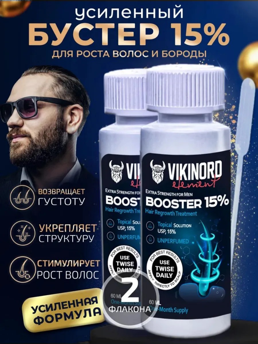 Мега-бустер Vikinord 15% 2 штуки + пипетка - это эффективное средство для активного роста волос, обеспечивающее питание волосяных луковиц и стимулирующее кровоток в коже. Vikinord 15% помогает отрастить густую бороду, усы или бакенбарды. Лосьон Vikinord начинает работать сразу после нанесения на кожу головы или лица. Все фолликулы, находящиеся в состоянии покоя, переходят в цикл роста, благодаря чему растут новые волосы. Концентрат бустер для роста волос Vikinord — это верный спутник на пути к густым и крепким волосам бороды, которая подчеркивает Вашу брутальность и индивидуальность. Vikinord 15% стимулирует рост волос, улучшая кровообращение в фолликулах, что приводит к заметному улучшению плотности и толщины волос, стимулируя рост бороды (уход за бородой). Лосьон Vikinord синоксидин 15% является уникальным косметическим средством, способствующим стимуляции роста мужских волос. Работает лучше чем сыворотка для волос, никотиновая кислота для волос. Подарите полезный мужской подарок мужу, сыну, брату, отцу, папе, дяде, парню, мужчине на день рождения! Как правильно использовать Vikinord 15% или 5%? Лосьон должен наноситься на чистый и высушенный участок кожи, будь-то на голове или на бороде. Его необходимо применять два раза в день на регулярной основе. Легкими движениями он втирается на желаемой для роста волос зоне. Для разового применения используется только одна доза в виде 1 мл раствора. Масло для бороды Vikinord (для роста бороды и волос) не содержит синоксидин или минокс. Подходит против выпадения волос и для бороды и усов. Не является лекарственным средством!!
