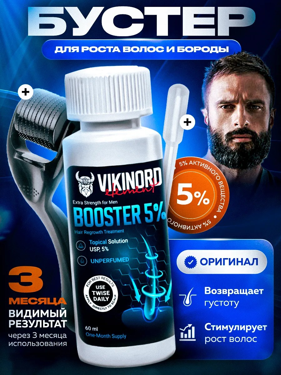 Концентрат бустер для роста волос Vikinord — это верный спутник на пути к густым и крепким волосам бороды, которая подчеркивает Вашу брутальность и индивидуальность. Vikinord 5% стимулирует рост волос, улучшая кровообращение в фолликулах, что приводит к заметному улучшению плотности и толщины волос, стимулируя рост бороды (уход за бородой).