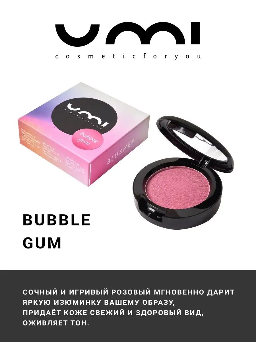 UMI BLUSHERВ самом расцвете!Мягкие матовые румяна UMI придают вашей коже естественный, соблазнительный румянец, подчеркивают скулы и корректируют контур лица. Высокое содержание насыщенных пигментов обеспечивает стойкий результат. Румяна нежно и комфортно ложатся на кожу, сохраняя первоначальный оттенок в течение всего дня. Вы можете регулировать яркость и глубину цвета, выбирая разное количество продукта и создавать подходящий по настроению образ на каждый день. Нежный и романтичный или дерзкий и эффектный? Решаете только вы!Bubble gumСочный и игривый розовый мгновенно дарит яркую изюминку вашему образу, придаёт коже свежий и здоровый вид, оживляет тон.