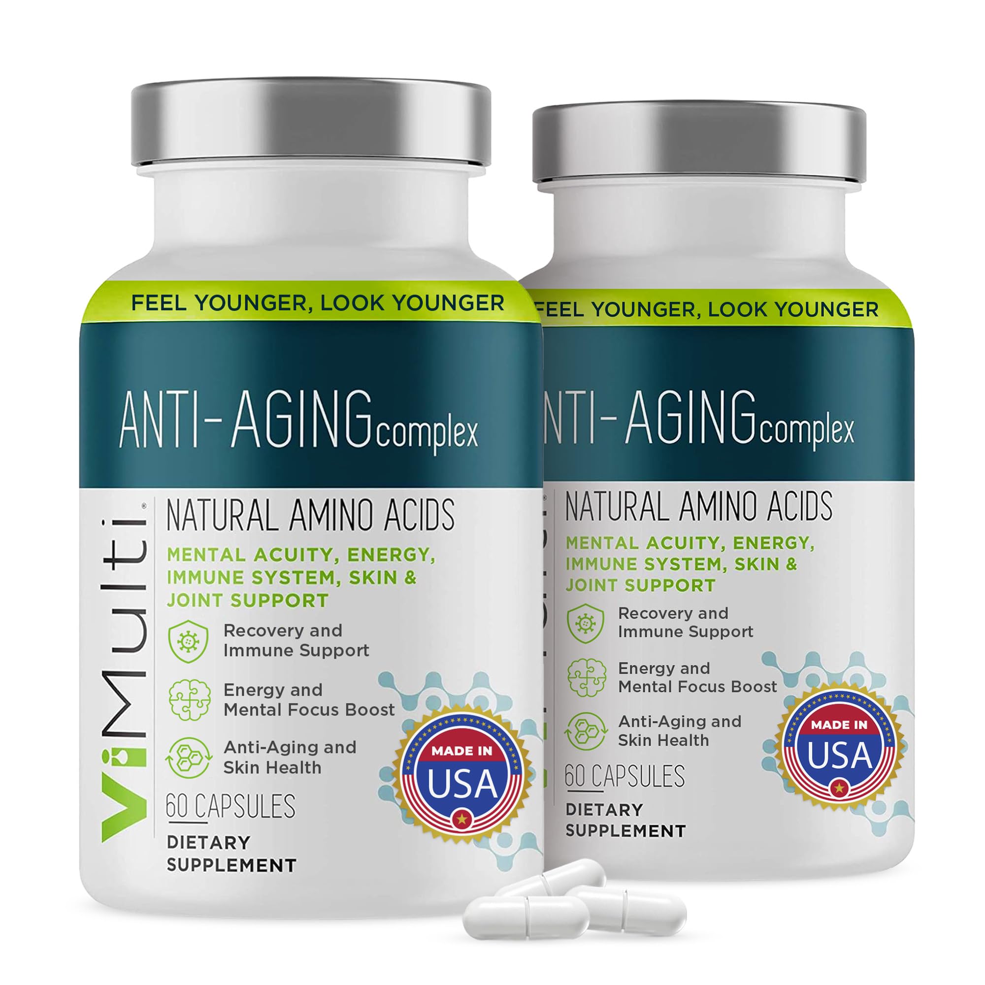 vimulti Anti-Aging Natural Amino Acids Supplement for Women & Men Supports Immune Health Energy Smoother Skin Tone & Restorative Sleep Anti-Aging Supplement Pills for Longevity 60 Caps 2 Pack