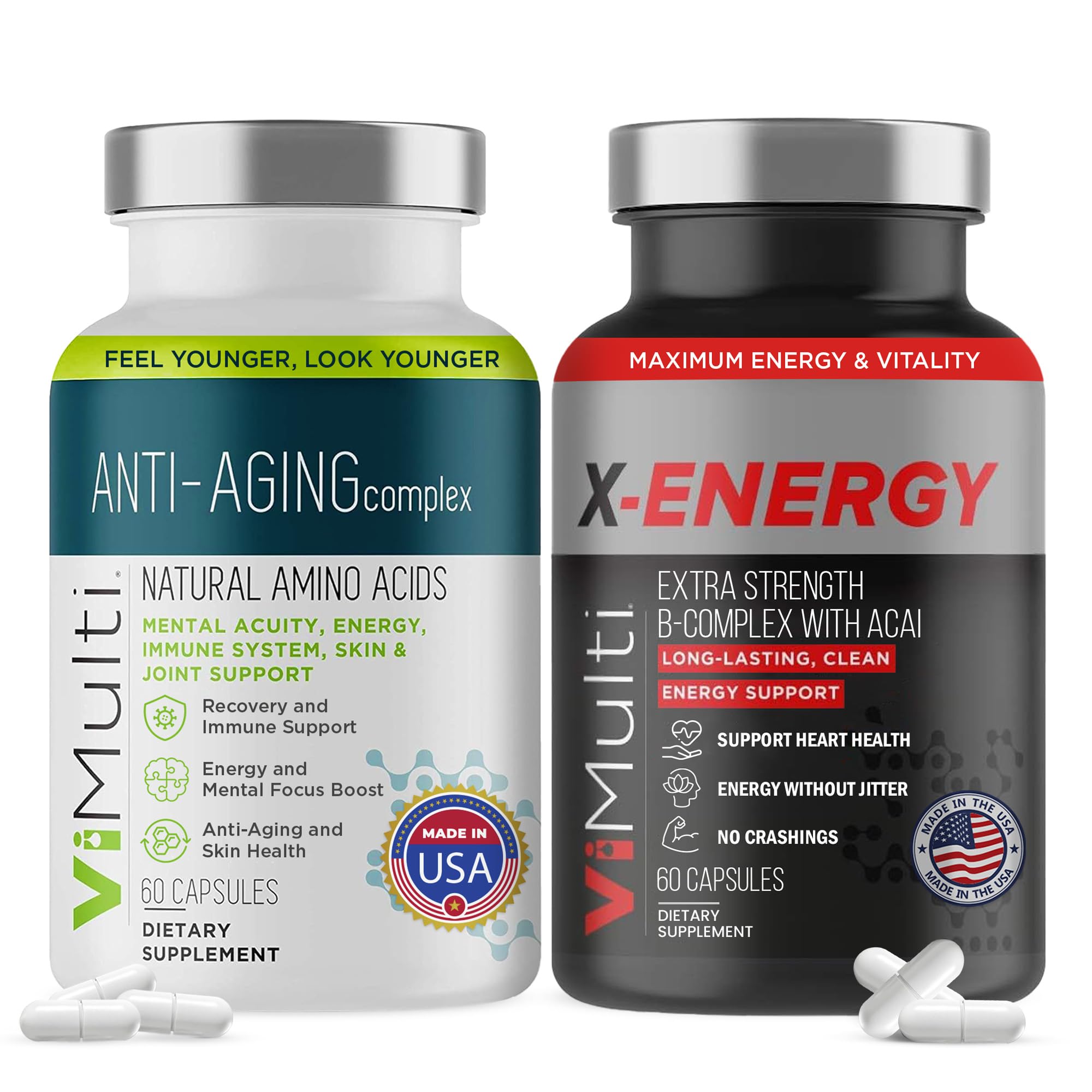 PURE, NATURAL INGREDIENTS FOR MAXIMUM WELLNESS: Manufactured in the USA in GMP-certified facilities, our premium supplements are crafted with 100 natural ingredients, ensuring safe and effective support for your energy, health, and anti-aging needs. ACHIEVE A HEALTHY GLOW: The combination of anti-aging amino acids and antioxidant-rich Acai berry helps restore your skin's natural vitality, promoting smoother, healthier, and more youthful skin, while nourishing your body from within. PROMOTE MUSCLE RECOVERY RESTFUL SLEEP: Restore your body with amino acids like L-glutamine and L-lysine, that supports in muscle recovery, immune support, and promoting better sleep and blood flow for complete physical rejuvenation. SUSTAINED ENERGY FOCUS: Packed with essential B vitamins and amino acids, this powerful blend delivers a steady, smooth boost of energy without jitters, supporting improved stamina, mental clarity, and focus throughout your busy day. REVITALIZE RENEW YOUR BODY: The ultimate anti-aging and energy-boosting duo—ViMulti Anti-Aging Amino Acids X-Energy Vitamin B Complex—support youthful skin, joint health, and overall vitality, helping you feel younger and look radiant every day.