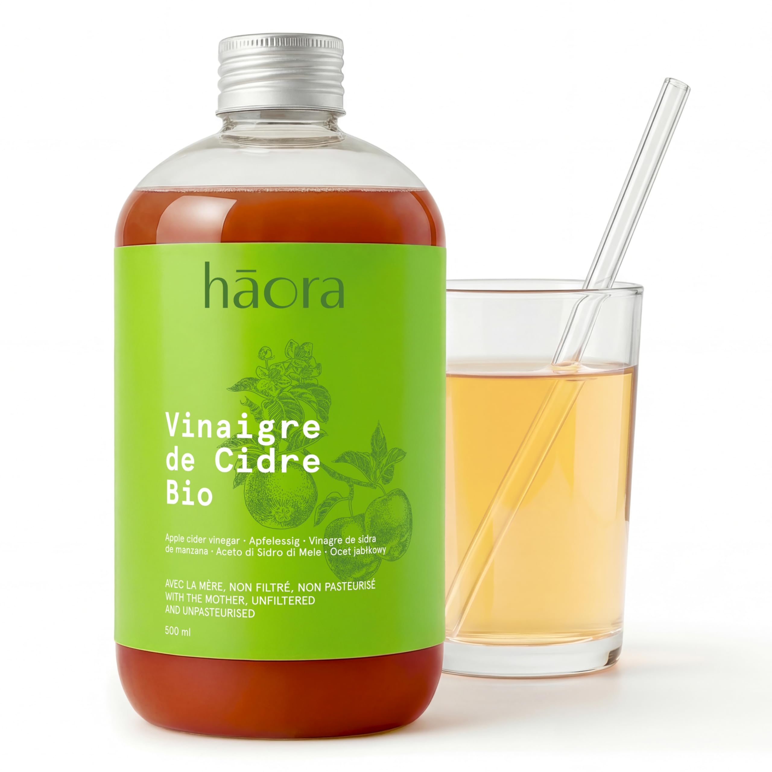 BOOSTS IMMUNITY AND VITALITY THANKS TO THE MOTHER. Enriched with probiotics and antioxidants thanks to its naturally preserved mother, this vinegar acts as a protective shield for your immune system. Used regularly, it increases your resistance to external aggressors. PROMOTES RESTFUL SLEEP. By aiding digestion, Haora apple cider vinegar helps your body naturally produce melatonin, the sleep hormone. Enjoy restful nights and optimal recovery after each day. NATURALLY REGULATES BLOOD SUGAR. Thanks to its high acetic acid content, a spoonful before each meal is enough to moderate your blood sugar spike. Effective for naturally controlling blood sugar levels, it supports better daily weight management. EASY TO USE. Whether in a glass of water, juice, or your culinary creations, a tablespoon is all you need to enjoy its many benefits. Hot, cold, or sparkling, easily adapt its use to your tastes and preferences. 100 NATURAL AND AUTHENTIC. Made from organic apples, our Haora cider vinegar is unfiltered and unpasteurized, guaranteeing maximum content of essential nutrients. Enjoy superior quality with a formula rich in natural enzymes for unparalleled health benefits.