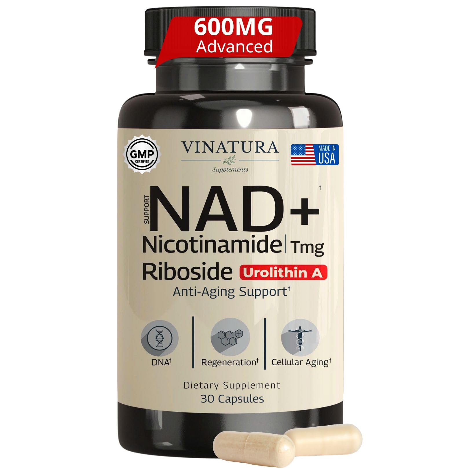 VINATURA NAD Supplement Nicotinamide Riboside with Resveratrol - Advanced NAD+ Supplement with TMG and Urolithin A for Women and Men - 30 Vegan Capsules