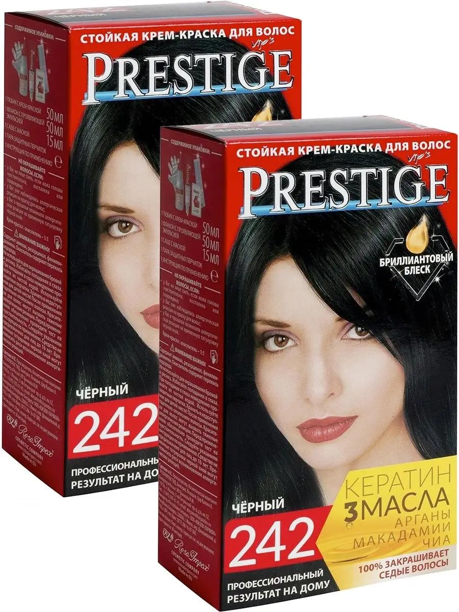 VIPs Prestige is the new formula enriched with a special complex of vitamins and wheat proteins that protect damaged hair. After coloring, your hair will have a healthier and more vibrant appearance. Easy to use. Application instructions: Squeeze one tube of cream dye into a bottle containing an oxidizing agent and shake thoroughly. Apply the mixture to wet hair through the bottle cap, distributing it evenly throughout all strands. Leave on for 25-30 minutes. If you plan to blend the color with your roots, after applying ¾ of the mixture 20 minutes, distribute the remaining ¼ along the entire length and leave on for an additional 10 minutes. Wash out the dye. After the set time, the dye will lather on the hair with a small amount of water and wash out completely. Apply conditioner for 2 minutes, then rinse thoroughly. Active ingredients and composition: one tube of cream-colored paint, one bottle of developing emulsion, one pair of protective gloves, and instructions for use. INGREDIENTS Aqua, Glycol Stearate, Ammonia, Sodium Laureth Sulfate, Glyceryl Stearate SE, Cetearyl Alcohol, Cocamide MEA, Cetyl Alcohol, Glycerin, Ceteareth-25, Sodium Metabisulfite, Tetrasodium EDTA, Ascorbic Acid, Etidronic Acid, PEG-30 Lanolin, Glyceryl Linoleate, Sodium Chloride, Hydrolyzed Wheat Protein, Hydroxycetyl Hydroxyethyl Dimonium Chloride, Paraffinum Liquidum, Sodium Benzoate, P-Phenylenyldiamine, P-Aminophenol, M-Aminophenol, Resorcinol. Aqua, Hydrogen Peroxide, Cetearyl Alcohol, Stearyl Alcohol, Steareth-7, Steareth-10, Glyceryl Stearate, Sodium Cetearyl Sulfate, Glycerin, Sodium Lauryl Sulfate, Pentasodium Pentetate, Disodium Pyrophosphate, Sodium Stannate, Sodium benzoate, Phosphoric Acid Aqua, Cetear. Alcohol, Amodimethicone, Paraffinum Liquidum, Behentrimonium Chloride, Ceteare H-25, Glycerin, Trideceth-12, Stearamidopropyl Dimethylamine, Silicone Quaternium-20, Hydroxyethylcellulose, Cetrimonium Chloride, Polyquaternium-22, Argania spinosa Kernel Oil, Macadami. A Ternifolia Seed Oil, Salvia Hispanica Seed Oil, Hydrolyzed Keratin, Potassium Sorbate, Citric Acid, Fragrance, 2-Bromo-2-Nitropropane-1,3-Diol SAFETY WARNING Cosmetic product, for external use only. Avoid contact with eyes. Keep out of reach of children. See moreCrème résistante pour cheveux 242 Noir "Vip's Prestige" à l'huile d'argan, macadamia et chia - ? (2 )DESCRIPTION DU PRODUIT DESCRIPTION DU PRODUIT VIPs Prestige est la nouvelle formule enrichie d'un complexe spécial de vitamines et de protéines de blé qui protègent les cheveux abîmés. Après la teinture de vos cheveux auront une vie saine et plus essentielle. Ease Coiffeur. Mode d'application : un tube de peinture crème est pressé dans une bouteille avec un agent oxydant et agité soigneusement. L'application du mélange est effectuée sur les cheveux mouillés par le bouchon de la bouteille, en la répartissant uniformément sur toutes les mèches. En attente - 25-30 minutes. Si vous prévoyez d'aligner la couleur avec les racines repoussées, 20 minutes après avoir appliqué ¾ du mélange, répartir le ¼ restant sur toute la longueur et maintenez enfoncé pendant 10 minutes supplémentaires. Laver la peinture. Après le temps réglé, la composition sur les cheveux, avec une petite quantité d'eau, fait mousse et est complètement lavée. Appliquer un baume attentionné - pendant 2 minutes, après quoi un rinçage minutieux est nécessaire. Principes actifs composition : un tube de peinture couleur crème, une bouteille d'émulsion en développement, une paire de gants de protection, instructions pour l'utilisation. INGRÉDIENTS Aqua, Glycol Stearate, Ammonia, Sodium Laureth Sulfate, Glyceryl Stearate Se, Cetearyl Alcohol, Cocamide Mea, Cetyl Alcohol, Glycerin, Ceteareth 25, Sodium Metabisulfite, Tetrasodium Edta, Ascorbic Acid, Etidronic Acid, Peg 30 LanoLin, Glyceryl L inoleate, chlorure de sodium, hydrolyzed Wheat Protein, hydroxycetyl hydroxyethyl Dimonium chlororide, paraffinum liquidum, benzoate de sodium, P Phe Nylenediamine, P Aminophenol, M Aminophenol, Resorcinol. Aqua, Hydrogen Peroxide, Cetearyl Alcohol, Stearyl Alcohol, Steareth-7, Steareth-10, Glyceryl Stearate, Sodium Cetearyl Sulfate, Glycerin, Sodium Lauryl Sulfate, Pentasodium Pentetate, Disodium Pyrophosphate, Sodium Stannate, Sodium benzoate, Phosphoric Acid Aqua, Cetear. Alcohol, Amodimethicone, Paraffinum Liquidum, Behentrimonium Chloride, Ceteare H-25, Glycerin, Trideceth-12, Stearamidopropyl Dimethylamine, Silicone Quaternium-20, Hydroxyethylcellulose, Cetrimonium Chloride, Polyquaternium-22, Argania spinosa Kernel Oil, Macadami. A Ternifolia Seed Oil, Salvia Hispanica Seed Oil, Hydrolyzed Keratin, Potassium Sorbate, Citric Acid, Parfum, 2-Bromo-2-Nitropropane-1,3-Diol AVERTISSEMENT DE SÉCURITÉ Produit cosmétique, uniquement pour un usage externe, éviter tout contact avec les yeux. Tenir hors de portée des enfants. Voir plus
