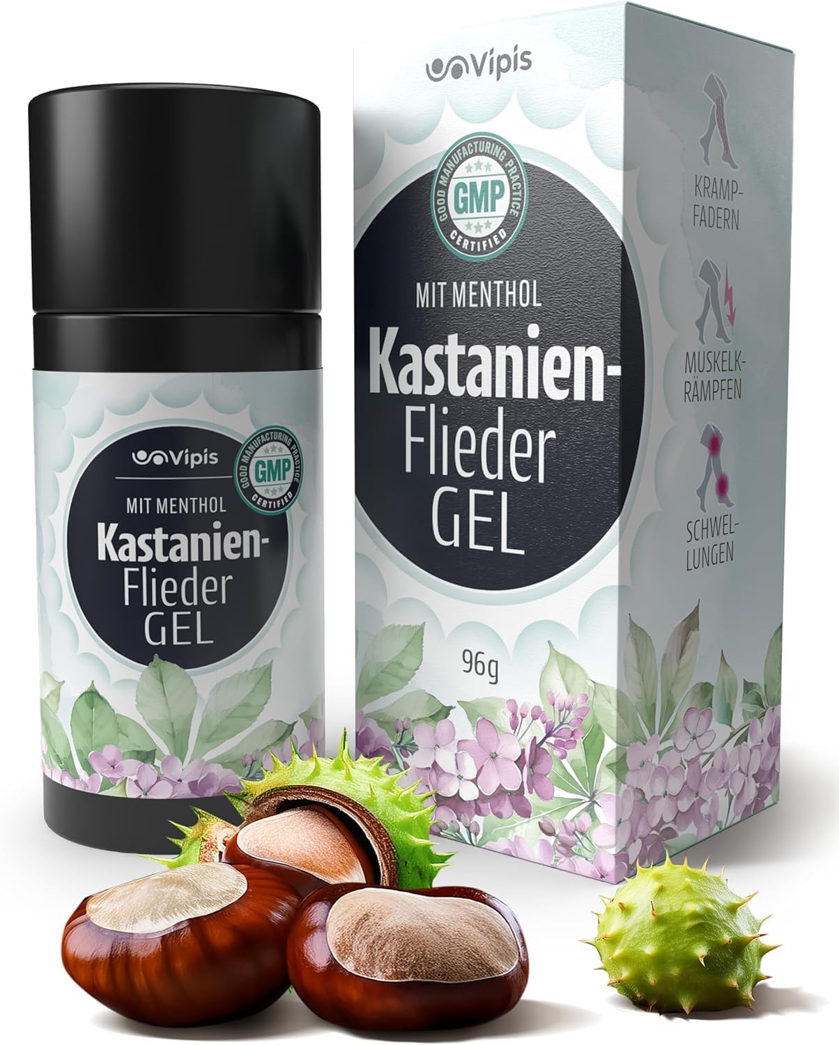 DESCRIPTION DU PRODUIT VIPIS Rosskastanien Salbe Gel - Venensalbe Krampfadern Creme mit Lila Menthol - Schnell Einziehend Kühlende Creme gegen Besenreiser, Müde Schwere Beine, Geschwollene Füße Muskeln