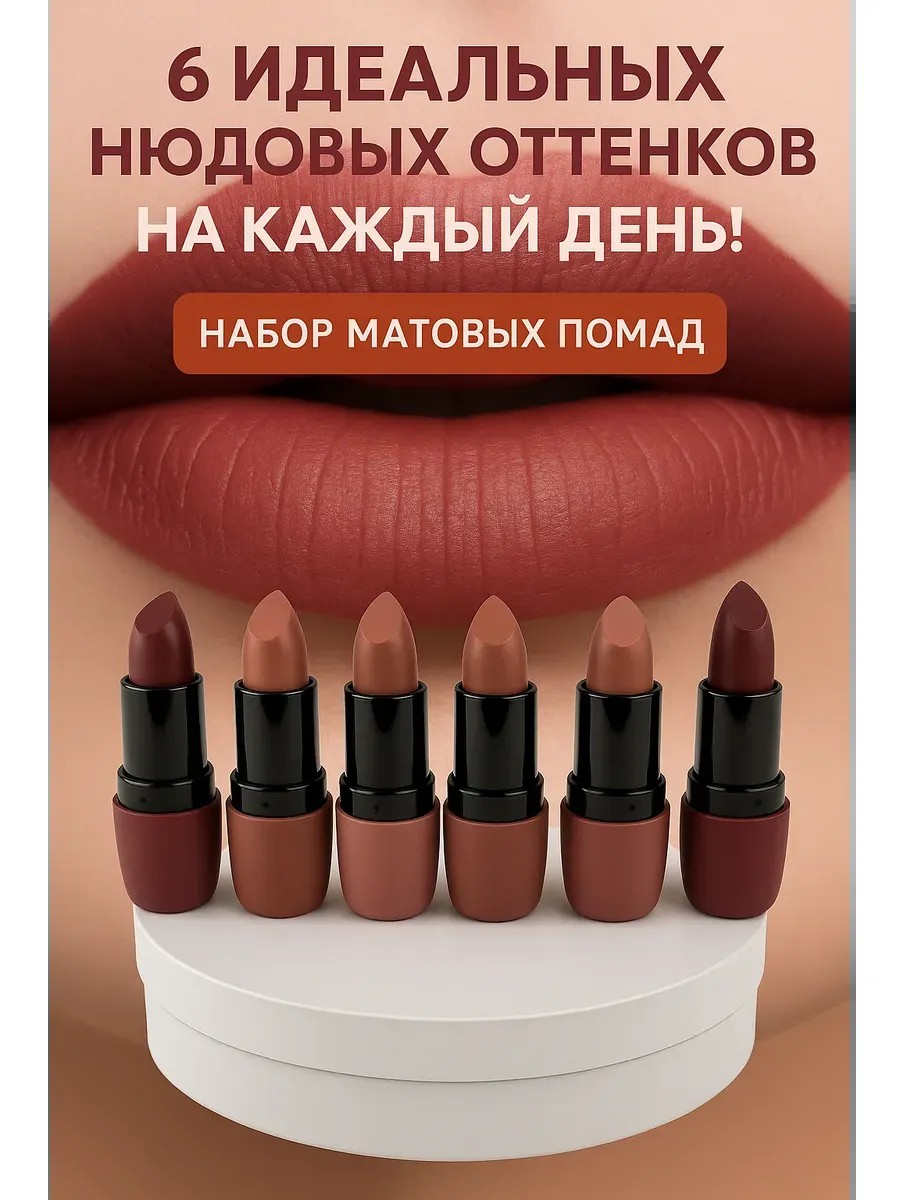 Discover a set of matte lipsticks with 6 universal shades – from rich burgundy to warm nude.