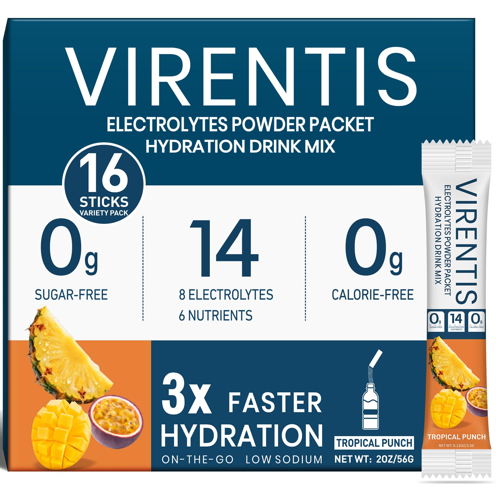 Convenient Use Friendly Service: Mix 1 stick pack with 16 oz of water to find your favorite taste, shake or stir until dissolved, ready to drink, iced is better taste. Warm Tips: Please add water first, then pour in the electrolytes powder packets shake or stir to dissolve faster! If you're not satisfied with our product, feel free to contact us anytime. We offer 24h service and can arrange for replacements or full refunds without the need for return. Portable Packets Easy to Use: The 16 sticks electrolyte packets with an independent portable packet design contains multiple flavors mixed pack. It is lightweight and adopting an easy to tear film packaging design, it can be torn open immediately and suitable for outdoor sports, travel, high-temperature operations, and other scenarios.It's the perfect addition to your travel essentials, cruise essentials, party favors. Say goodbye to the tired body with our cheers after hydrating. Multidimensional Nutrition Health Adaptation: The electrolytes powder no sugar can prevent dehydration,fatigue by high-intensity exercise, travel or busy work, which can quickly rehydrate, balance body fluids, speed up recovery and keep you energized.support cellular energy metabolism and regulate bodily functions. It is suitable for high-temperature environment workers such as firefighters and construction workers, as well as people who pursue a vibrant life. Tropical Punch Flavor Deliciously Refreshing: Our hydration packets sugar free, Tropical Punch Flavor of mango, pineapple, passion fruit. The taste is refreshing,neither sweet nor salty, Simultaneously meeting various dietary needs such as keto, vegetarian, and low-carbon water, non GMO, gluten free etc. Energy Supplementation Efficient Hydration: Our sugar free electrolytes that helps to replenish lost water in our body quickly. It contains essential 8 electrolytes and 6 nutrients like Sodium,Calcium, Potassium,Zinc,Magnesium,Niacin,Pantothenic Acid,Phosphorus,Manganese,Chloride,Vitamin C,Vitamin D,Vitamin B6,Vitamin B12.Achieve a hydration efficiency three times higher than ordinary water,relieving dehydration symptoms,supporting the body to quickly recover energy.