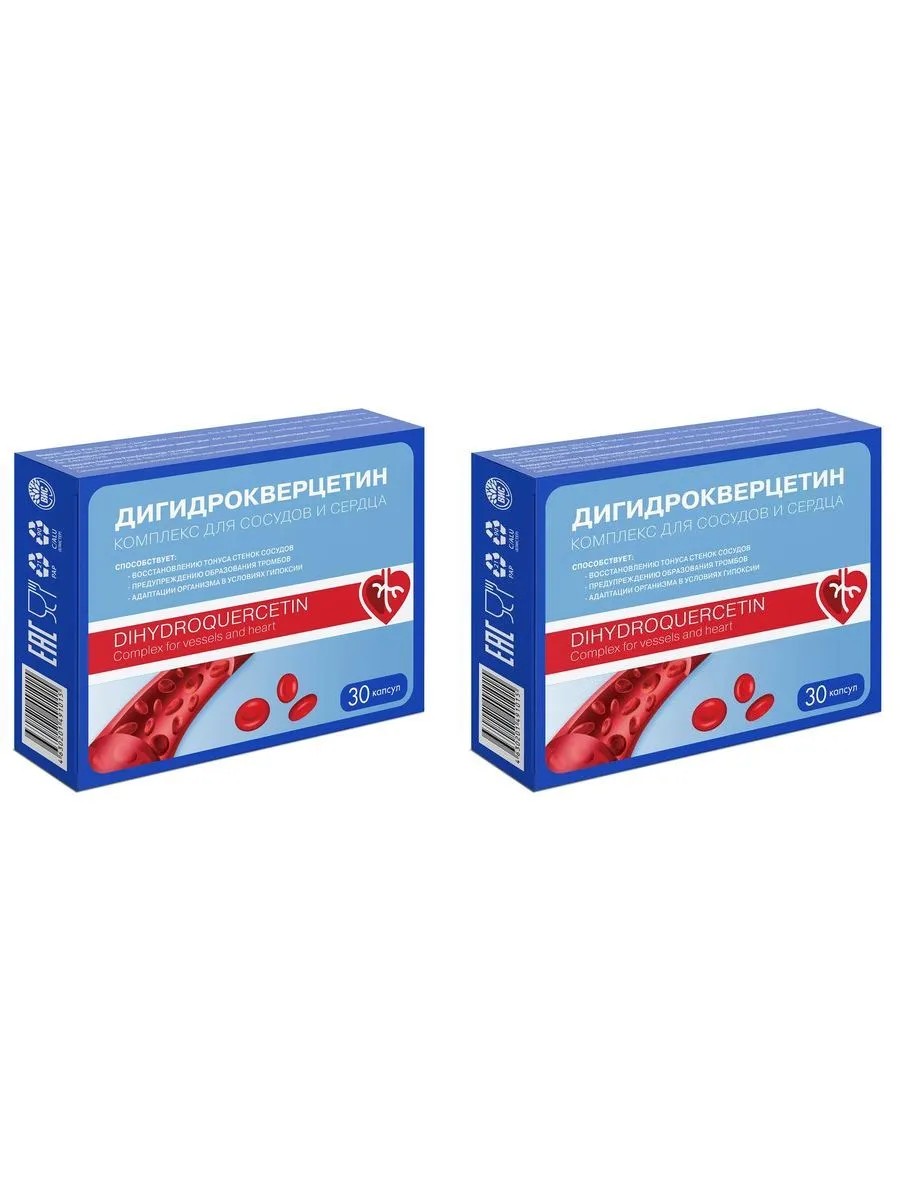 Dihydroquercetin complex for blood vessels and heart n30 capsules 0.33g. Helps maintain the functional state of the cardiovascular system, restore vascular tone, improve blood microcirculation, prevent blood clots, antioxidant, promotes the body's adaptation to hypoxia. As a biologically active food supplement - a source of dihydroquercetin. Microcrystalline cellulose (carrier), capsule shell (hydroxypropyl methylcellulose or gelatin, without dyes or with added dyes, titanium dioxide or hydroxide or iron oxides), dihydroquercetin, magnesium oxide, calcium stearate (anti-caking agents). As a biologically active food supplement - a source of dihydroquercetin.