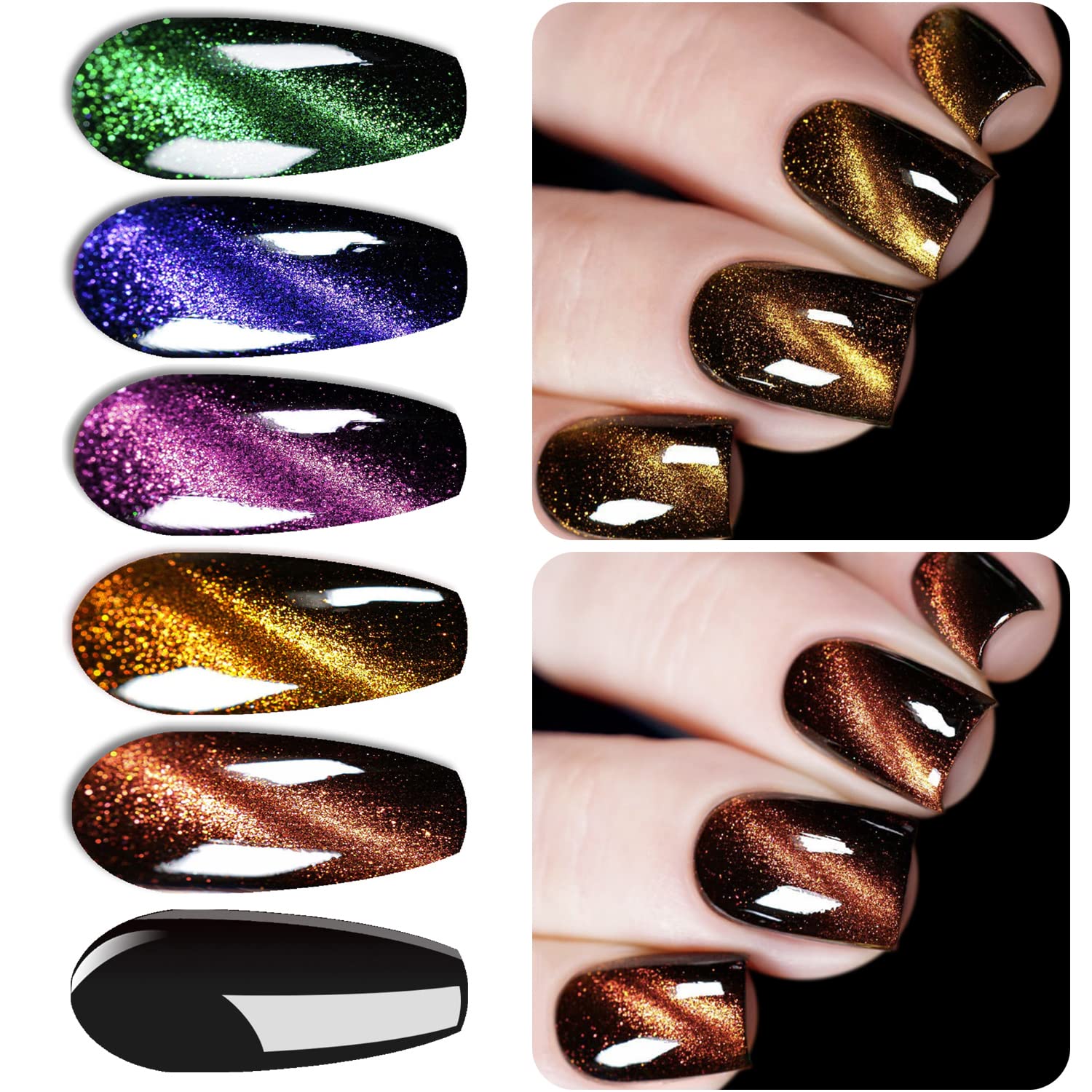 Vishine CAT EYE GEL POLISH SET This collection contains 8ML5Pcs Cat Eye Gel Polish, 8ML1PC Black Gel, 1PC Magnetic Stick, Packaged in a pretty box, it's definitely the best gift for Christmas, Valentine's Day, Birthday and any other festival AURORA & MILKY WAY EFFECTS With this Magnetic Gel Polish you will get different fantastic Cat Eye Effects, like the galactic hole effect, slash effect, starry sky effect, etc. Attractive color changing and cat eye effects will surprise you. Different light and angles will show different cat eye effects WARM TIPS All of our picture show applying the black gel as base. Do not cure the cat eye gel before using the magnet. We suggest you can learn more skills from videos online, you'll get a more satisfying effect LONG LASTING AND HEALTHY MATERIAL All of Vishine products are made of natural resin environmentally-friendly ingredients, low smell, non-toxic, do not hurt your nails and body. Could last up to about 28+days with proper nail prepfiling, buffering, and cleaning