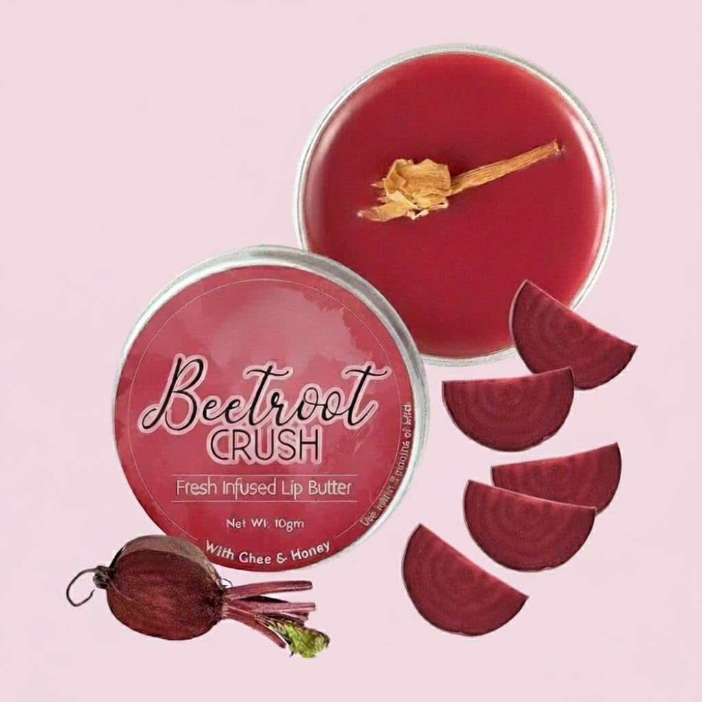 FRESH MADE Daily Inspired by Grandma secrets 100 Natural Kitchen fresh ultra moisturising Lip Butter made of Desi Ghee, Raw Honey and slow HEAT Infused beetroot jasmine. The Beetroot Crush lip butter is packed with the goodness of fresh beetroot, jasmine, desi ghee, eucalyptus honey, kokum butter, shea butter pure cold pressed oils for express lip repair, moisturising nourishment, lip reddening and protection against aging, and darkening. ZERO chemicals preservatives. ZERO mineral oil paraffins. When to Use Express chapped lips, dry lips, cracked lips relief Pre-lipstick and pre-lipgloss application After lip scrubbing After removing lip makeup Before going to sleep for overnight repair After alcohol consumption or smoking Frequently in a day if heavy tea coffee consumption Frequently in a day if long AC exposure Before swimming Frequently in a day if prone to self biting or licking of lips Apply a bit of lip butter on your lips. Massage lightly for the butter to get absorbed. Use as often as needed during the day. For maximum protection, apply a generous amount before sleep.