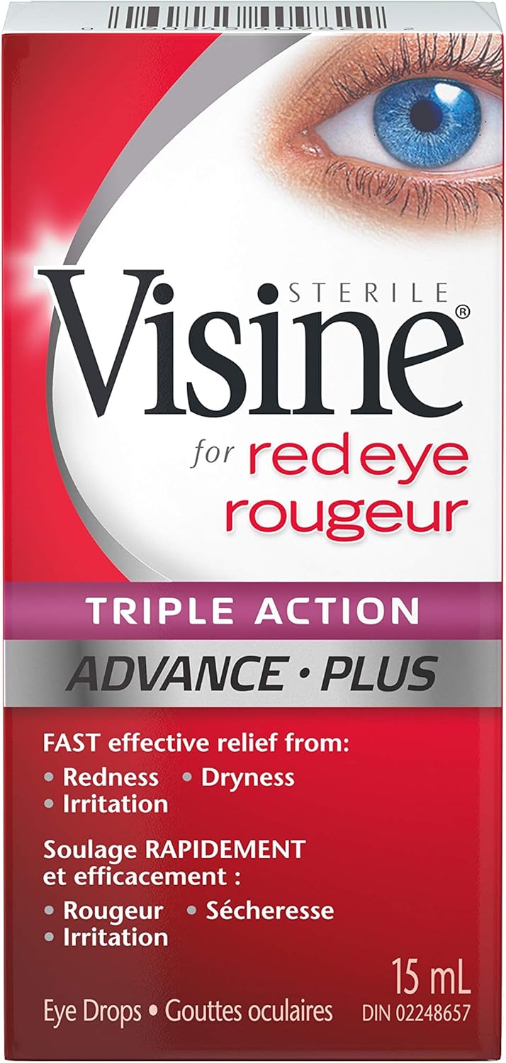 • Soothe, refresh, and protect dry, red, and irritated eyes with Visine Triple Action Eye Drops. These triple action eye drops combine Visine Red Eye Relief with moisturizers. This product comes with one 15-millilitre bottle of eye drops.