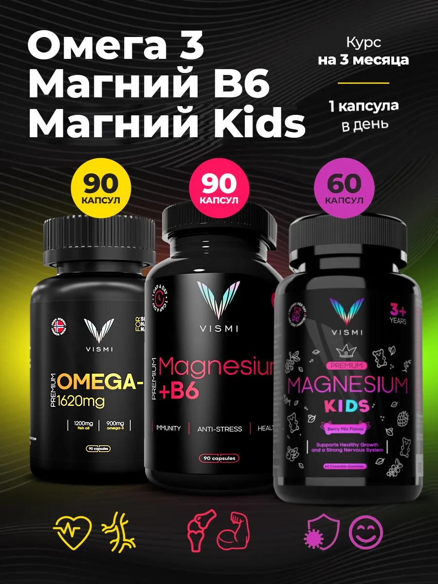 Откройте для себя силу нашего эксклюзивного набора, который включает в себя три ключевых компонента для поддержки вашего здоровья и благополучия: Омега 3, Магний B6 и Морской Коллаген. Этот мощный комплекс направлен на улучшение общего состояния здоровья, поддержание функций сердечно-сосудистой системы, улучшение когнитивных функций, укрепление костей и суставов, а также поддержание здоровья кожи, волос и ногтей.