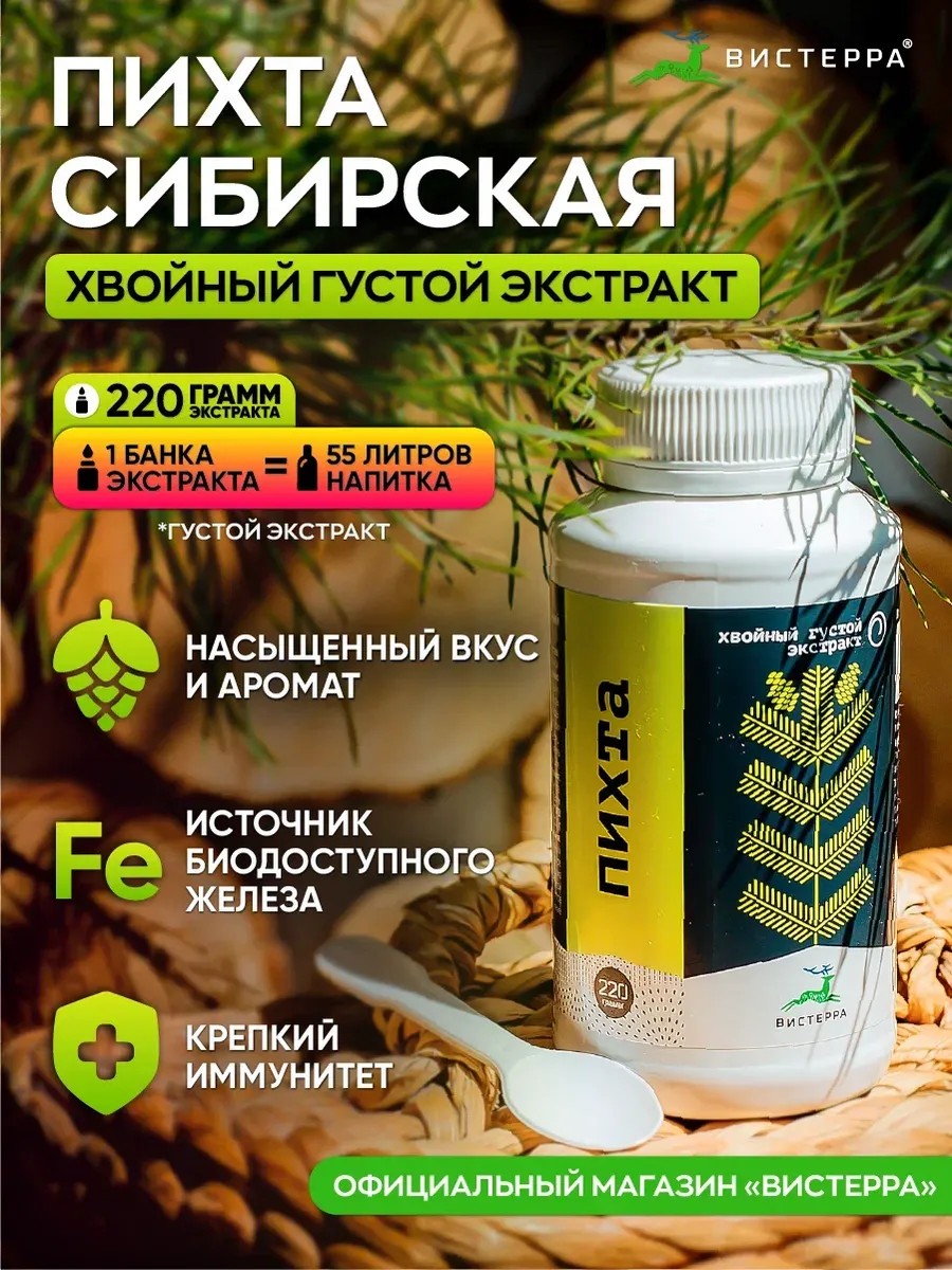 Dense Siberian fir extract is a natural, concentrated, sugar-free, and caffeine-free vitamin drink made using multi-stage extraction and vacuum concentration from Siberian fir needles. Fir extract has immunostimulating, regenerating, restorative, anti-inflammatory, hematopoietic, and antibacterial properties. Indications: decreased immunity, heart disease, kidney and urinary tract diseases, respiratory diseases, female reproductive system disorders, radiation sickness, burns and various skin lesions, stress and fatigue, and prevention of complications after serious illnesses, surgeries, and injuries. 220g. A thick extract yields 55 liters of ready-to-use drink, which contains valuable micro- and macroelements in bioavailable form: iron, manganese, zinc, copper, and many others, as well as organic acids, polyphenolic complexes, tannins, carotene, chlorophyll, polyprenols, and phytosterols.