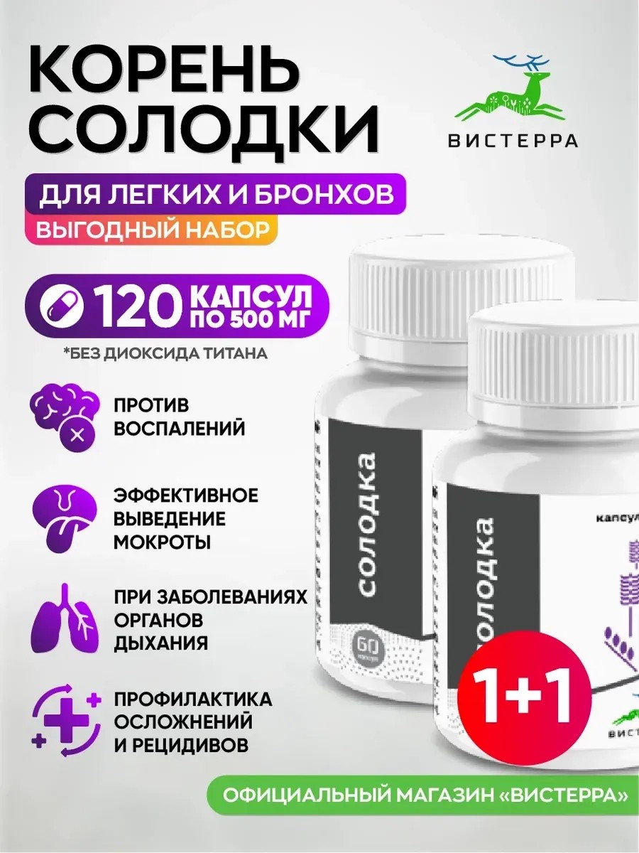 Корень солодки обладает мощным противовоспалительным, противовирусным и антибактериальным действием. Экстракт представляют собой концентрированную сухую вытяжку из корня солодки. Солодка — это природное средство от кашля и отхаркивающее средство. Экстракт корня солодки эффективен от респираторных заболеваний органов дыхания и при лечении органов пищеварения. Корень солодки также богат антиоксидантами, которые играют решающую роль в поддержании здоровья кожи, укреплении иммунной системы, поддержка для желудка и кишечника. Эффективен при лечении кожных заболеваний, таких как экзема и псориаз, помогает уменьшить покраснение, отек и зуд, вызванные экземой. Применяется при заболеваниях органов дыхания: острый и хронический бронхит, трахеит, ателектаз при закупорке бронхов слизистой пробкой, бронхоэктатическая болезнь, пневмония, бронхиальная астма. Широко используется при заболеваниях пищеварительной системы: язва желудка и двенадцатиперстной кишки (в составе комплексной терапии), гастрита от, энтерита. Глицериновая кислота в солодке помогает лечить симптомы расстройства желудка или плохого пищеварения, а также язву желудка. Солодка способствует снижению уровня холестерина в крови и исчезновению холестериновых бляшек в кровеносных сосудах. Солодка в капсулах богата изофлавонами, которые поддерживают баланс эстрогена и прогестерона в организме, что помогает при симптомах менопаузы и предменструального синдрома. Экстракт солодки применяется при лечении ревматоидного артрита. Подходит как для мужчин, так и для женщин, считается безопасным для детей при умеренном употреблении. Важно отметить, что корень солодки может вызывать индивидуальные аллергические реакции, по этой причине перед тем, как давать ее детям, особенно на регулярной основе, рекомендуется проконсультироваться с врачом в комплексной терапии заболевания органов дыхания (главным образом при наличии трудно отделяемого, густого и вязкого секрета). Капсульная форма удобна и проста в применении, одной упаковки (60 капсул) хватает на полный курс. Небольшой размер капсул и легкость проглатывания делают их предпочтительным вариантом для многих людей. Не содержат диоксид титана, полностью прозрачные, но при этом дополнительно защищают экстракт от света и воздуха, что помогает сохранить его эффективность.