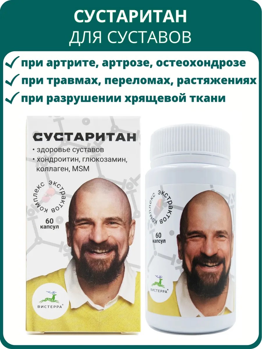 | Комплектация | Сустаритан, 60 капсул от Вистерра.; При травмах, ушибах, растяжениях, артрите, артрозе, остеохондрозе и воспалении суставов. |