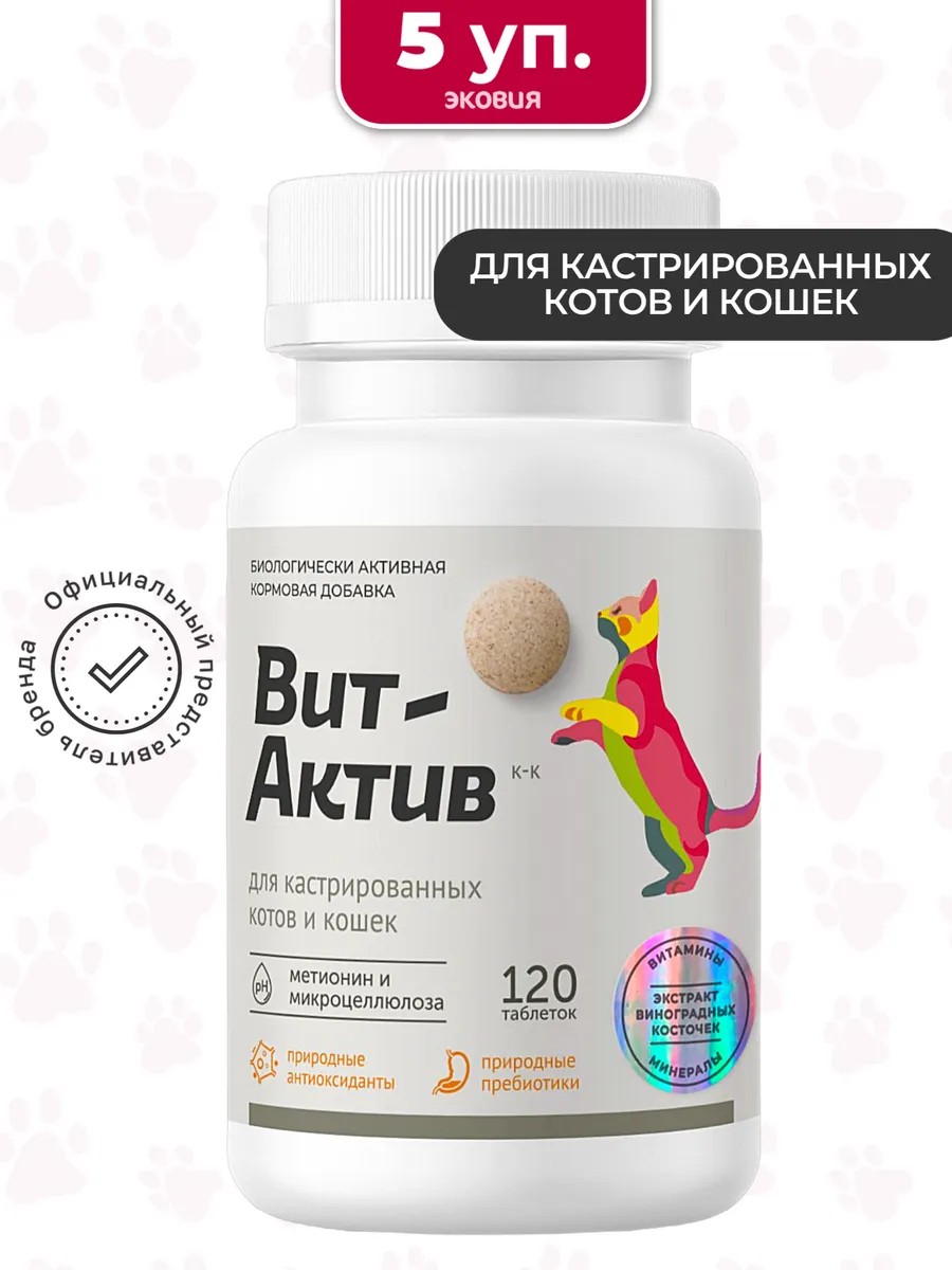 | Комплектация | Витаминно-минеральный комплекс Вит-Актив для кастрированных котов и кошек (120 таблеток); Количество упаковок указано на главном фото; В каждой упаковке 120 таблеток |