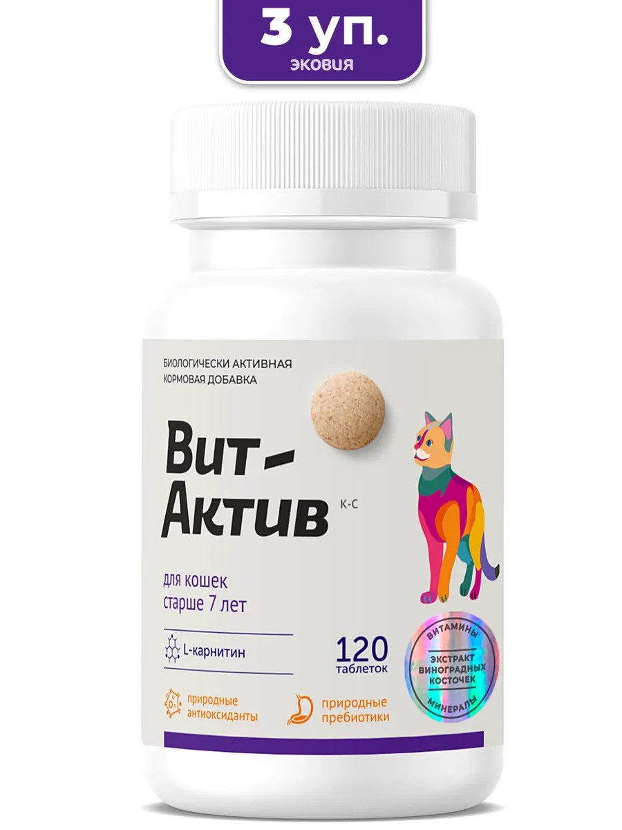 | Комплектация | Витаминно-минеральный комплекс Вит-Актив для кошек старше 7 лет (120 таблеток); количество указано на главном фото |