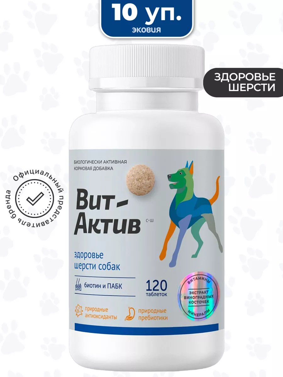 Vit-Active is a vitamin and mineral complex designed to improve the condition of dogs' skin and coat and meet their physiological needs for vitamins, amino acids, and minerals.