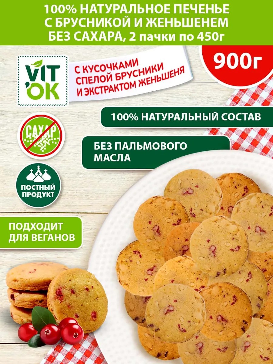 Печенье без сахара натуральное с брусникой и женьшенем, 900г