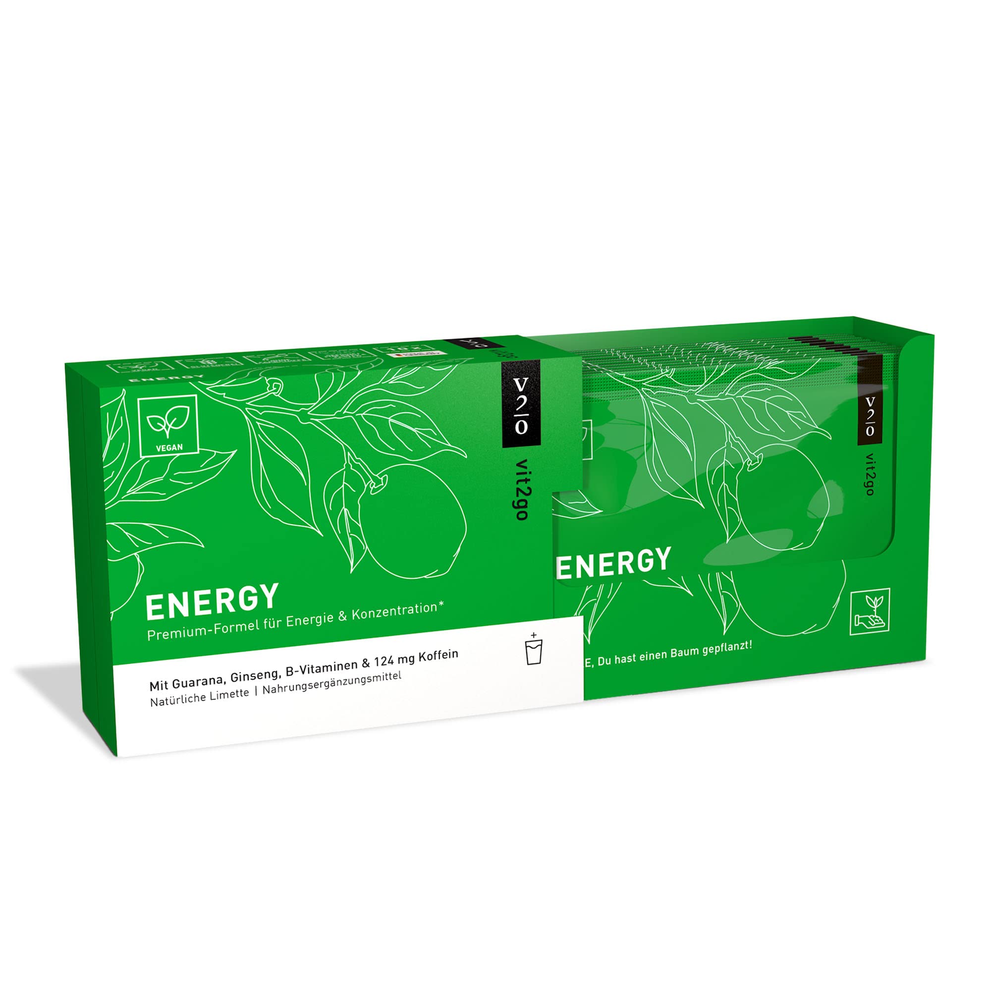 Vit2Go ENERGY now with a new and improved formula – the quick brain boost. This perfectly tailored food supplement works naturally and can be taken whenever you need mental and physical power: for example, during sports, fitness activities, at school, university, and work. The ingredients (caffeine, guarana, L-tyrosine, and taurine) are in high doses. Additional vitamins, minerals, and trace elements complement the Energy Booster. Riboflavin helps reduce tiredness and fatigue. Unlike many energy drinks, Vit2Go Energy contains highly dosed ingredients that are perfectly coordinated with each other and offer high bioavailability. You no longer need to swallow caffeine tablets or take other pills and capsules that serve as anti-fatigue products. Vitamin B5 (pantothenic acid) contributes to normal mental performance. Vitamins B1, B2, niacin, pantothenic acid, B6, B12, and calcium contribute to normal energy-yielding metabolism. Vitamin C and zinc contribute to the normal function of the immune system. Zinc contributes to the protection of cells from oxidative stress. Biotin contributes to normal, energy-yielding metabolism. ENERGY gives you the right boost in any situation and is 100 vegan and made in Germany. Ingredients at a glance: Caffeine Guarana Taurine Pepper extract Ginseng Vitamin B complex (8 B vitamins, including vitamin B12, vitamin B1, vitamin B3, vitamin B5, vitamin B6, etc.) 4 amino acids (including L-tyrosine) Other minerals (e.g., zinc) and plant substances (e.g., ginseng) INGREDIENTS Orange fruit powder on maltodextrin, magnesium citrate, lime fruit powder on maltodextrin, calcium citrate, L-ornithine hydrochloride, citric acid, dextrose, sodium bicarbonate (acidity regulator), lemon fruit powder on maltodextrin, L-tyrosine, taurine, flavoring, ascorbic acid, caffeine, 1 caffeine. Arana extract 1 , ginseng root powder, zinc gluconate, L-tryptophan, calcium carbonate, calcium pantothenate 0.24 , niacinamide 0.2 , sweetener stevioglycoside, ginger root extract, pyridoxine hydrochloride 0.06 , sweetener sucralose, riboflavin 0.05 , thiamine hydrochloride 0.05 , pepper extract, cholecalciferol, folic acid 0.004 , chromium (III) chloride, sodium selenate, biotin 0.0009 , cyanocobalamin 0.1 DIRECTIONS To use Vit2Go ENERGY, mix one sachet in 400 ml of water or juice. Drink it whenever you need a hydrating beverage for mental and physical power. SAFETY WARNING This instant drink powder should not be taken on an empty stomach. Store in a cool, dry place away from direct sunlight. See more100 SATISFACTION GUARANTEE: We are confident in the effectiveness of our energy drink powder. If you don't feel the effects of our energy booster, we will refund the full purchase price. Made in Germany: This energy drink is 100 German-made and suitable for vegans and diabetics. Get the delicious and effective vitamin powder drink now. Quick and easy: Simply mix one sachet into 400 ml of water or juice and drink it whenever you need a hydration boost for mental and physical power! Energy works particularly effectively thanks to black pepper as a bioenhancer. This instant drink powder should not be taken on an empty stomach. Essential nutrients: Vit2Go Energy is a natural source of extra energy with 8 B vitamins, 4 amino acids, natural guarana, ginseng, taurine, and the famous caffeine-containing energy drink! This powdered sports drink also contains valuable vitamins and minerals that are perfectly coordinated to provide you with optimal support. ENERGY SHOT: Need a quick energy boost? Whenever you need a boost for your performance (for example, at work, before sports, at the gym, or before exams), you can mix Vit2Go ENERGY as an energy drink or sports powder.Vit2go ENERGY (10 sachets) – Energy Drink en poudre (124 mg), guarana et taurine, est votre boisson énergisante idéale pour un regain d'énergie instantané.DESCRIPTION DU PRODUIT DESCRIPTION DU PRODUIT Vit2Go ENERGY maintenant avec une nouvelle formule améliorée – le boost rapide des cerveaux. Ce complément alimentaire parfaitement adapté agit naturellement et peut être pris si vous avez besoin de puissance mentale et physique : par exemple au sport, au fitness, à l'école, à l'université et au travail. Les ingrédients (caféine, guarana, L tyrosine et taurine) sont hautement dosés. D'autres vitamines, minéraux et oligo-éléments complètent l'Energy Booster. La riboflavine contribue à réduire la fatigue et la fatigue. Contrairement à de nombreuses boissons énergétiques, Energy de Vit2Go contient des ingrédients hautement dosés et parfaitement coordonnés les uns aux autres avec une biodisponibilité élevée. Vous n'avez plus besoin d'avaler des comprimés de caféine ou de prendre d'autres comprimés et gélules qui servent de produit anti-fatigue. La vitamine B5 (acide pantothénique) contribue à la performance mentale normale. La vitamine B1, B2, la niacine, l'acide pantothénique, B6, B12 et le calcium contribuent au métabolisme énergétique normal. La vitamine C et le zinc contribuent au fonctionnement normal du système immunitaire. Le zinc contribue à protéger les cellules contre le stress oxydatif. La biotine contribue à un métabolisme normal et énergisant. ENERGY vous donne le bon coup de pied dans toutes les situations et est 100 végétalien et fabriqué en Allemagne. Aperçu des ingrédients : Caféine. Guarana. taurine. Extrait de poivre ginseng. Complexe de vitamine B (8 vitamines B, dont vitamine B12, vitamine B1, vitamine B3, vitamine B5, vitamine B6, etc.) 4 acides aminés (dont la L-tyrosine). Autres minéraux (par ex. zinc) et substances végétales (par exemple le ginseng) INGRÉDIENTS Poudre de fruits orange sur maltodextrine, citrate de magnésium, poudre de fruits citron vert sur maltodextrine, citrate de calcium, chlorhydrate L-ornithine, acidifiant acide citrique, dextrose, régulateur d'acidité bicarbonate de sodium, poudre de fruits citron sur maltodextrine, L-tyrosine, taurine, a