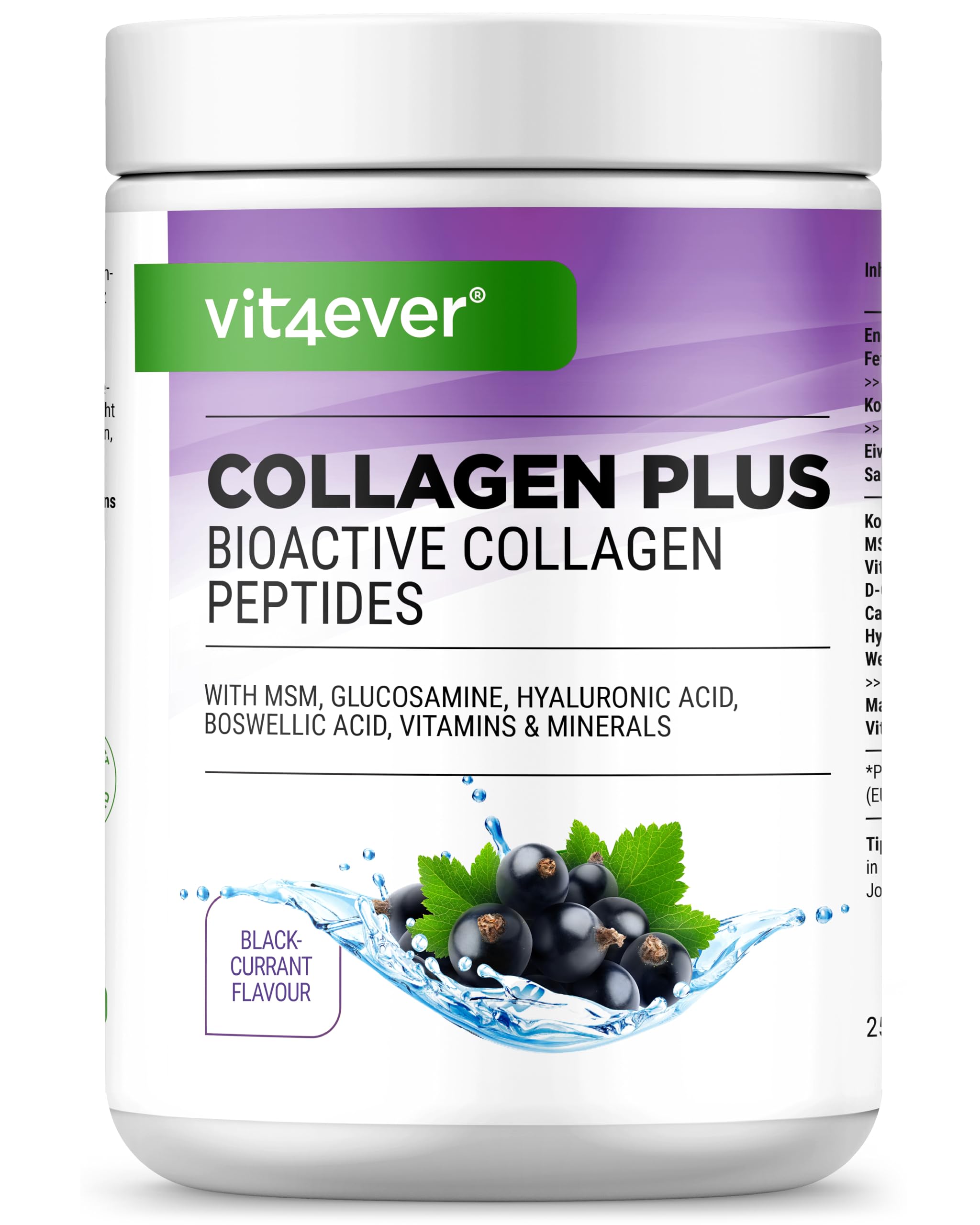 VIT4EVER QUALITY: The Vit4ever range offers a wide variety of food supplements for every target group. Our products are made from premium raw materials and produced exclusively in carefully selected EU companies to guarantee consistently high quality. Germany and the Netherlands are among our production sites. If you are not satisfied with a product or need any assistance, we are always here to help. POLLUTANT-FREE: Collagen Plus contains premium bovine collagen from animal-friendly farms. It is free from harmful substances, antibiotics, and hormones, and is also halal, ensuring maximum purity and quality. VERSATILE USE: Our Collagen Plus comes in a convenient 500g tub. With its delicious taste, included measuring spoon, and perfect solubility, it fits effortlessly into your daily routine, making it ideal for daily intake. PREMIUM COLLAGEN: Our Collagen Plus contains high-quality collagen powder with 93 natural and highly digestible proteins of types I, II, and III. Thanks to its optimal molecule size of 2.0 kDa, it allows for efficient absorption and rapid availability of nutrients in the body. A SENSITIVE COMBINATION: Collagen Plus combines hydrolyzed collagen, frankincense extract, hyaluronic acid, glucosamine sulfate, MSM, and carefully selected vitamins and minerals. This unique formula has been specially designed to address multiple needs. Thanks to the thoughtful combination of high-quality ingredients, synergistic effects are promoted, providing optimal support for your body.Collagen Plus - 500 g de poudre avec MSM, glucosamine HCL, acide hyaluronique, extrait d'encens - 100 collagène bioactif hydrolysé peptides - collagène type 1, 2 3 - goût CassisQUALITÉ VIT4EVER : La gamme Vit4ever propose une multitude de compléments alimentaires pour chaque groupe cible. Nos produits sont fabriqués à partir de matières premières de qualité supérieure et produits exclusivement dans des entreprises de l'UE soigneusement sélectionnées afin de garantir une qualité élevée et constante. L'Allemagne et les Pays-Bas font partie de nos sites de production. Si vous n'êtes pas satisfait d'un produit ou si vous avez besoin d'aide, nous sommes toujours à votre disposition. SANS POLLUANTS : Collagen Plus contient du collagène bovin de qualité supérieure issu d'élevages respectueux des animaux. Il est exempt de substances nocives, d'antibiotiques et d'hormones et est en outre halal, pour une pureté et une qualité maximales. UTILISATION POLYVALENTE : notre Collagène Plus est livré dans une boîte pratique de 500g. Avec son goût délicieux, la cuillère doseuse fournie et sa solubilité parfaite, il s'intègre sans effort dans la vie quotidienne, idéal pour un apport quotidien. COLLAGENE PREMIUM : notre Collagène Plus contient une poudre de collagène de haute qualité contenant 93 de protéines naturelles et très digestes de types I, II et III. Grâce à la taille optimale de la molécule de 2,0 kDa, il permet une absorption efficace et une disponibilité rapide des nutriments dans le corps. UNE COMBINAISON SENSIBLE : Collagen Plus associe du collagène hydrolysé, un extrait d'encens, de l'acide hyaluronique, du sulfate de glucosamine, du MSM ainsi que des vitamines et des minéraux soigneusement sélectionnés. Cette composition unique a été spécialement conçue pour répondre à des besoins multiples. Grâce à la combinaison réfléchie d'ingrédients de haute qualité, des effets synergiques sont favorisés, offrant un soutien optimal à votre corps.