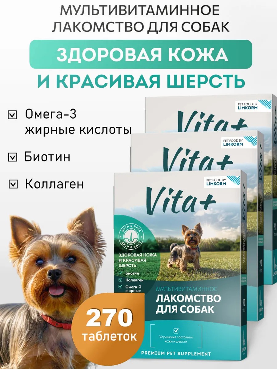 | Полное наименование товара | Лакомство для собак Vita+ Здоровая кожа и красивая шерсть 3 упаковки по 90 таблеток |