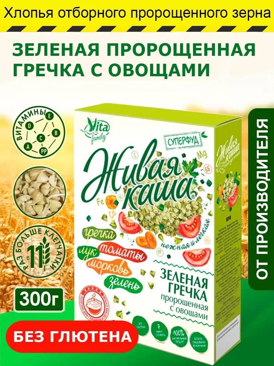 Vita instant porridge made from sprouted green buckwheat will become a favorite and healthy addition to a healthy menu for the whole family. Unlike traditional brown buckwheat, green buckwheat is uncooked and retains its beneficial properties, which are greatly enhanced by sprouting. This instant porridge, sugar-free and rich in micro- and macronutrients, contains valuable rutin. It's perfect for quick snacks, as a sugar-free treat, for those on a keto diet, and as part of a healthy diet. Sprouted buckwheat grains contain organic acids: citric, oxalic, and malic. Green buckwheat protein contains 18 amino acids, 8 of which are essential (not synthesized by the human body). Does not contain salt, gluten, artificial flavors, or GMOs. Perfect as a light side dish or as a standalone breakfast porridge for those who abstain from sweets. The delicate flavor of green buckwheat with vegetables is loved by both adults and children. You can add butter or grated cheese to the hot porridge; it goes well with fresh salads, especially with avocado and greens. Preparation: To prepare the porridge: pour 2 cups of water over 1 cup of the mixture (2 servings), stir, and bring to a boil. Cover and simmer for 20-25 minutes. Add salt to taste. To prepare the side dish: pour 2 cups of water over 1 cup of the mixture (2 servings), stir, and bring to a boil. Cover and simmer for 12-15 minutes. Add salt to taste. Vita, a live porridge made from sprouted green buckwheat, will work wonders for your body when consumed regularly. Green buckwheat porridge offers amazing health benefits for both adults and children! Its nutrient content increases significantly during sprouting—for example, vitamin C levels increase 12-fold. Even after heat treatment during cooking, sprouted buckwheat retains a large amount of antioxidants. It's suitable for diabetics and low-calorie diets. Starting your day with organic Altai products from "VitaFamily" will enrich your body with all the necessary nutrients and boost your energy and mood!