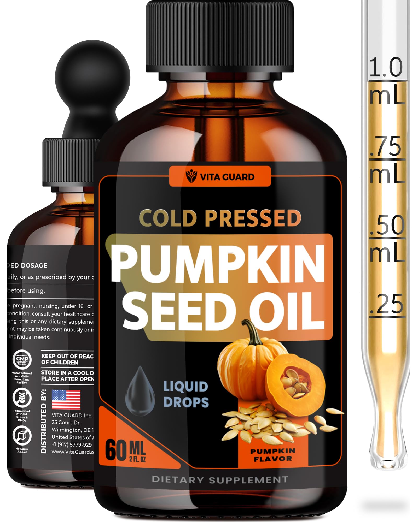 Vita Guard Cold Pressed Pumpkin Seed Oil Liquid Drops 2000mg per Serving | Vegan Gluten-Free Non-GMO | Hair Skin & Prostate Support | Natural Pumpkin Flavor | 60ml Dietary Supplement