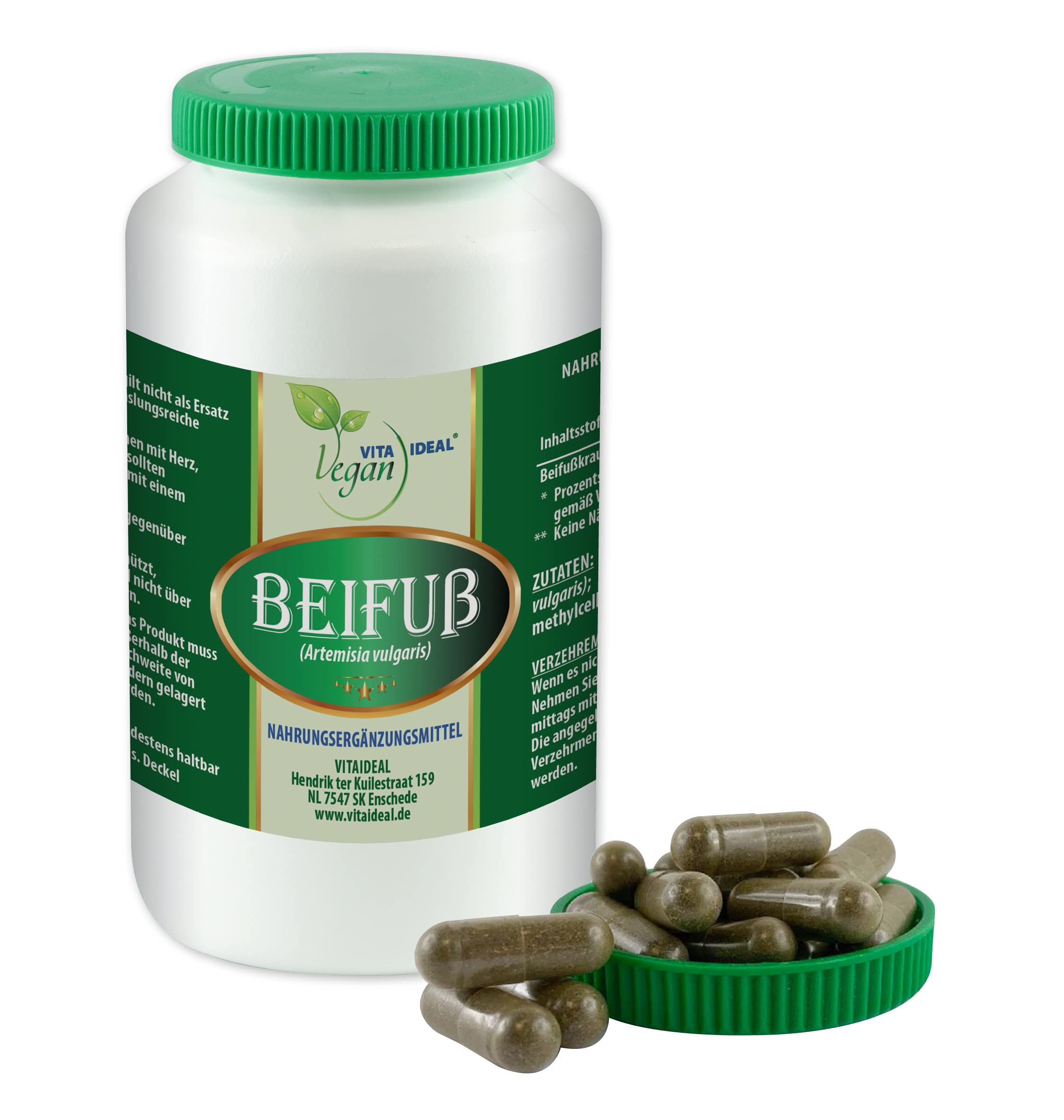 IMPORTANT INSTRUCTIONS: - The dietary supplement is not considered a replacement for a balanced and varied diet. - Pregnant women, breastfeeding and people with heart, kidneys and or liver problems should only take the product after consultation with a treating doctor. - Not suitable for an allergy to an ingredient. - Protected by light, dry and not over 25 C. - The product must be stored outside the range of children. Ingredients ingredients Powder of: mugwort, capsule shell made of HPMC (hydroxypropylmethyl cellulose, herbal capsule shell) Instructions Please note the recommendation for consumption Warnings Important information: The dietary supplement is not considered a replacement for a balanced and varied diet.- Pregnant women, breastfeeding and people with heart, kidneys and or liver problems should only take the product after consultation with a treating doctor.- Not suitable for an allergy to an ingredient.- Protected by light, dry and not over 25 C.- The product must be stored outside the range of children. LEGAL NOTICE Although we always strive for the correctness of the product information on our website, it can sometimes happen that manufacturers change their list of ingredients.The product packaging and associated documents may contain information that goes beyond the information provided on our website and or differ from them.All product information on our website is provided alone for information purposes.We recommend that you not only rely on the information that is displayed on our website, but always carefully to read through the labels, warnings and instructions that are delivered with the goods before using or eating the goods.If you have security concerns of any kind or wish for the goods, please read the information on the labels and packaging carefully and contact the manufacturer.The information on this website cannot replace expert information from your doctor, pharmacist or another medical specialist.If you have any questions about compatibility, risks or side effects of taking or using the product, please contact your doctor or pharmacist.Our descriptions and other information on the goods do not serve the purpose of diagnosis, treatment, healing or prevention of an illness or a state of health.de is not liable for inaccurate or incorrect product information on the part of the manufacturers or other third parties.Your statutory rights are unaffected. Address manufacturer importer Vitaideal vegan, Hendrik Ter Kuilestraat 159, 7547 SK Enschede. MoreVitaIdeal stands for: customer satisfaction, quality, fair prices and further development.We are constantly expanding our range.Also like to take a look at the other vitalideal products.Customer satisfaction: The focus is on unrestricted customer satisfaction.If you have any questions, comments, or criticism, please contact us.In order to satisfy them and keep them as a customer, we will work on a solution at high pressure.This is the only way we can improve and develop.For further information on the effect and application, we recommend that you inform yourself in specialist literature in order to make the choice for your daily dosage and application according to age, weight and set goals.Information: If the product does not meet your expectations immediately - keep in mind: vegetable nutritional supplements have an effect over time.Important information: The dietary supplement is not considered a replacement for a balanced and varied diet.- Pregnant women, breastfeeding and people with heart, kidneys and or liver problems should only take the product after consultation with a treating doctor.- Not suitable for an allergy to an ingredient.- Protected by light, dry and not over 25 C.- The product must be stored outside the range of children.Recommended consumption: Unless otherwise prescribed: Take 1 capsule in the morning and 1 capsule with a large glass of water at noon.The recommended daily dose should not be exceeded.Ingredients: mugwort herb powder (Artemisia vulgaris), vegetable capsule shell: hydroxypropylmethyl cellulose (HPMC).Our powder is natural, vegetable and without additives.WICHTIGE HINWEISE: - Das Nahrungsergänzungsmittel gilt nicht als Ersatz für eine ausgewogene und abwechslungsreiche Ernährung. - Schwangere, stillende und Personen mit Herz, Nieren und oder Leber Problemen sollten das Produkt nur nach Rücksprache mit einem behandelnden Arzt einnehmen. - Nicht geeignet bei einer Allergie gegenüber einem Inhaltsstoff. - Lichtgeschützt, trocken und nicht über 25 C lagern. - Das Produkt muss außerhalb der Reichweite von Kindern gelagert werden. INHALTSSTOFFE ZUTATEN Pulver von: Beifuß, Kapselhülle aus HPMC (Hydroxypropylmethylcellulose, pflanzliche Kapselhülle) GEBRAUCHSANWEISUNG Bitte Verzehrempfehlung beachten WARNHINWEISE WICHTIGE HINWEISE: Das Nahrungsergänzungsmittel gilt nicht als Ersatz für eine ausgewogene und abwechslungsreiche Ernährung. - Schwangere, stillende und Personen mit Herz, Nieren und oder Leber Problemen sollten das Produkt nur nach Rücksprache mit einem behandelnden Arzt einnehmen. - Nicht geeignet bei einer Allergie gegenüber einem Inhaltsstoff. - Lichtgeschützt, trocken und nicht über 25 C lagern. - Das Produkt muss außerhalb der Reichweite von Kindern gelagert werden. RECHTLICHE HINWEISE Obwohl wir uns stets um die Richtigkeit der Produktangaben auf unserer Internetseite bemühen, kann es mitunter vorkommen, dass Hersteller ihr Zutatenverzeichnis ändern. Die Produktverpackung und zugehörigen Dokumente enthalten möglicherweise Angaben, die über die auf unserer Internetseite gemachten Angaben hinausgehen und oder sich von ihnen unterscheiden. Sämtliche Produktangaben auf unserer Internetseite werden allein zu Informationszwecken bereitgestellt. Wir empfehlen Ihnen, sich nicht allein auf die Angaben zu verlassen, die auf unserer Internetseite angezeigt werden, sondern sich vor Gebrauch bzw. Verzehr der Ware stets auch sorgfältig die Etiketten, Warnhinweise u