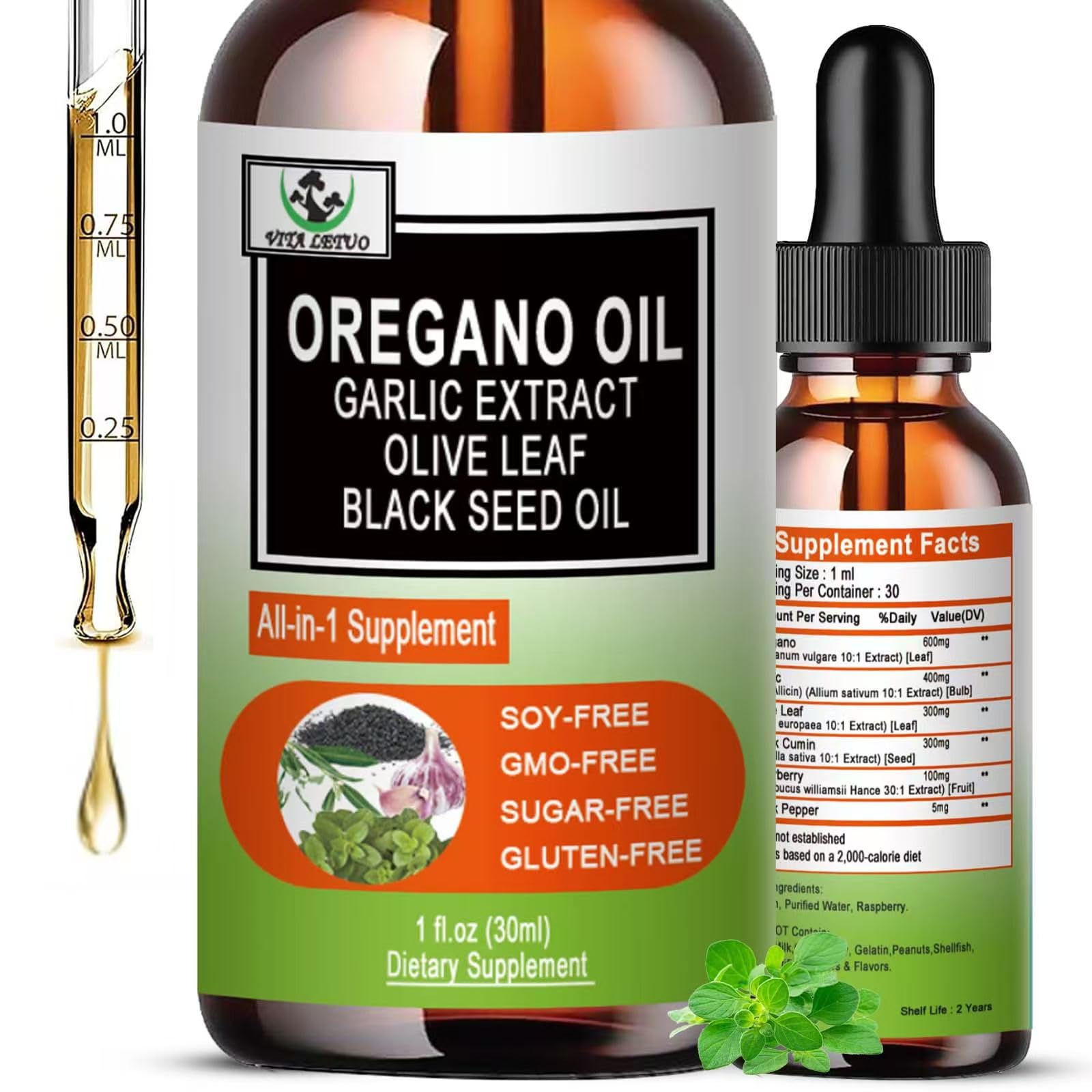 Vita letuo Organic Oil of Oregano with Black Seed Oil Oregano Oil Liquid Drops w/Garlic Olive Leaf Elderberry for Immune Digestive Support & Antioxidant Seasonal Support Supplement for Women Men