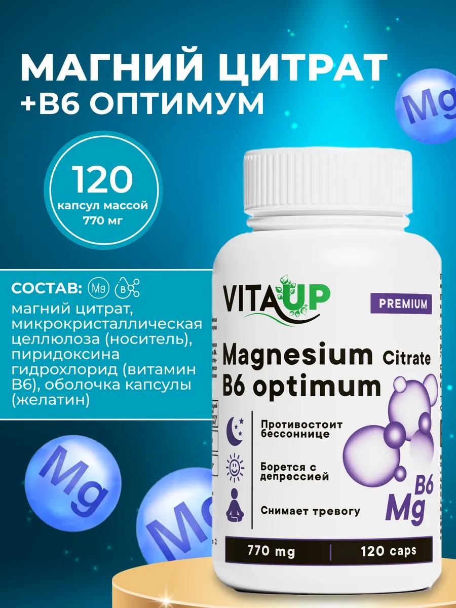 Magnesium Citrate 400 mg, designed to optimally transport magnesium into cells, is highly bioavailable. Magnesium regulates key metabolic processes and is especially important for the nervous and cardiovascular systems. Magnesium B6 is used for depression, as it can replace antidepressants, and for magnesium deficiency, which causes muscle spasms and cramps. Magnesium + B6 capsules replenish this vitamin, improving skin elasticity and the condition of hair and nails, accelerating metabolism and reducing appetite, supporting healthy teeth and bones, regulating vascular tone, and preventing blood pressure surges. A magnesium B6 deficiency leads to anxiety, insomnia, fatigue, and numbness in the extremities. Vitamin B6 normalizes melatonin synthesis, improving sleep and protecting cells from overstimulation. Stress vitamins contain an optimal dosage of magnesium B6 and are suitable for people of all ages. Magnesium is also used as a sedative for arrhythmia. It is essential for the proper functioning of cells and is involved in many metabolic reactions. Magnesium B6 reduces nervous system excitability, helps resist stress, and stabilizes cardiac function. Furthermore, this dietary supplement has a positive effect on blood circulation, regulates calcium and sodium balance in cells, and stimulates intestinal motility. A deficiency of this vitamin leads to coronary heart disease, heart failure, atherosclerosis, and arterial hypertension. Vitamin B6 improves magnesium absorption, but it also performs other functions. It is vital for the stable functioning of the nervous system and influences protein and fat metabolism. Magnesium Citrate + B6: Magnesium is necessary for the synthesis of brain intermediators and hemoglobin and, overall, ensures the functioning of over 60 different enzymatic systems. The vitamin and mineral complex Magnesium + B6 is designed to support emotional health. Nervous system overstrain leads to magnesium deficiency, which provokes irritability, fatigue, insomnia, and rapid heartbeat. Another deficiency symptom is muscle spasms associated with excess calcium and sodium. Magnesium deficiency is dangerous for the cardiovascular system, as heart muscle tone decreases and the heart finds it harder to pump blood. Taking a dietary supplement containing magnesium and vitamin B6 helps restore emotional balance, strengthen the nervous system, and relieve muscle tension. Magnesium and B6 have a sedative effect: sleep becomes deep and awakening is easier, stressful situations no longer unsettle you, and anxiety subsides. A dietary supplement containing magnesium and B6 restores cardiovascular function and helps maintain normal blood pressure. Mg + B6 is recommended for intense mental and physical stress. Dosage: 2 capsules twice daily.
