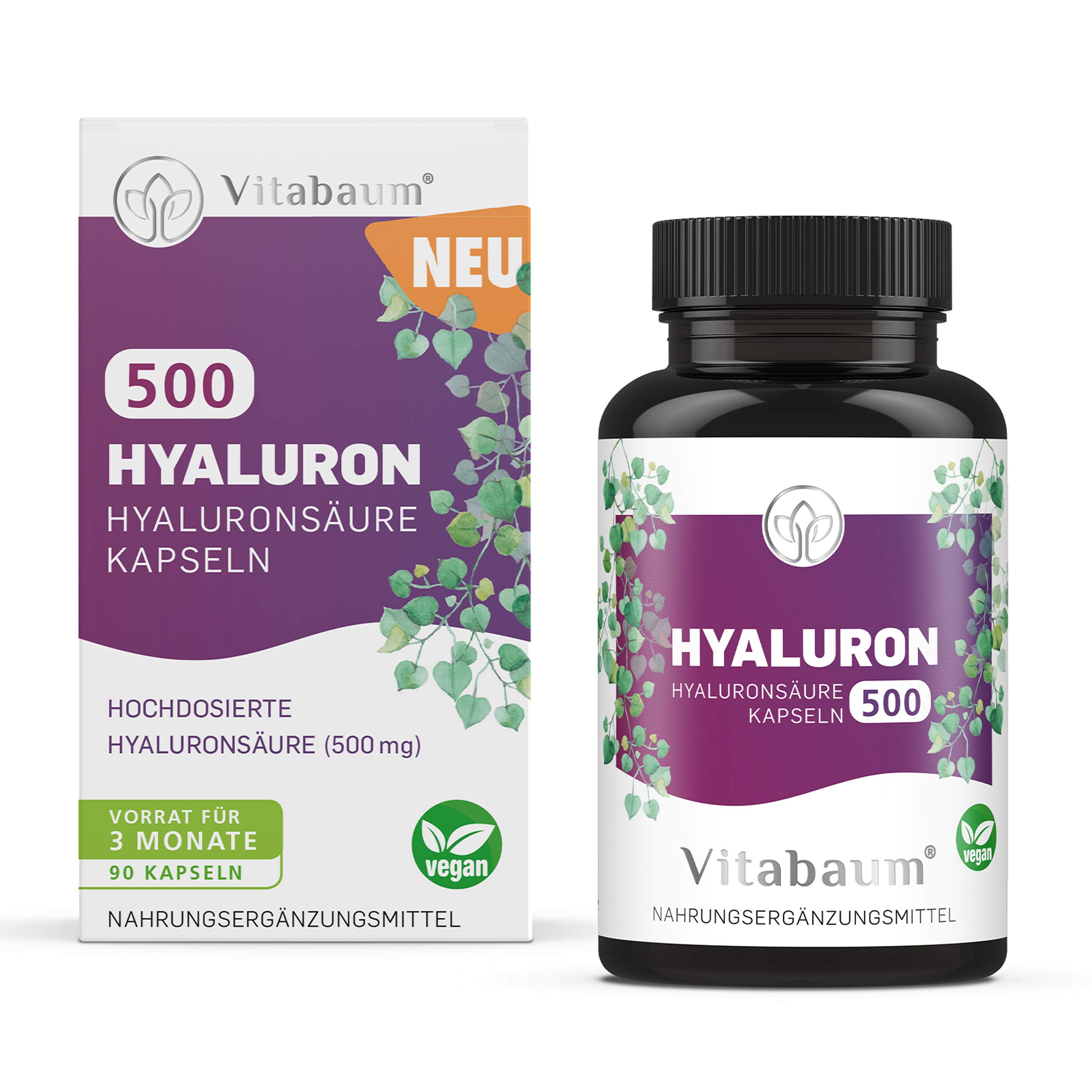 ""Hyaluronic acid 500 mg - 3 monthly supply"" Hyaluronic acid capsules hyaluronic acid can be found in many places in the human body.Most hyaluron contains the skin and the articular fluid.Bones and intervertebral discs, as well as the vitreous of the eye, also need hyaluronic acid.In the joints, Hyaluron acts as a natural lubricant and in the skin it acts as a water reservoir and ensures elasticity.In order to protect the tight, beautiful appearance of the skin, it is important to support you in the natural regeneration process - and that also works from the inside!Ingredients: hyaluronic acid powder, filler: travel extract, coating: hydroxypropylmethylcellale consumption recommendation: 1 capsule per day The recommended daily dose must not be exceeded. Ingredients ingredients Hyaluronic acid powder, filler: travel extract, coating: hydroxypropylmethyl cellulose Instructions Recommendation for consumption: Take 1 capsule of uncredited with sufficient liquid every day. Warnings Important information: The recommended daily dose must not be exceeded.Dietary supplements are not a substitute for a varied and balanced diet. Address manufacturer importer Benley GmbH, Heinrich-Lanz-Allee 12, 60437 Frankfurt am Main Moreelement dance weight: 0.056 kilograms.For skin, bones joints: hyaluronic acid is produced by the body itself and is an important part of the joint lubrication (synovial fluid).Made in Germany: This product is manufactured in strictly tested systems in Germany.Regardless of laboratory testing: An independent German laboratory is checked by an independent German laboratory.Vegan without undesirable zsuatzen: Vita tree hyaluronic acid capsules are vegan and free of unwanted additives.Hyaluron highly dose: Our vita tree hyaluronic acid capsules contain 500mg extra high -dose pure hyaluronic acid (sodium hyaluronate).""Hyaluronsäure 500 mg - 3 monatsvorrat"" Hyaluronsäure Kapseln Hyaluronsäure ist an vielen stellen im menschlichen Körper zu finden. Am meisten Hyaluron enthalten die Haut und die Gelenkflüssigkeit. Aber auch Knochen und Bandscheiben, sowie der Glaskörper des Auges benötigen Hyaluronsäure. In den Gelenken wirkt Hyaluron als natürliches Schmiermittel und in der Haut wirkt es als Wasserspeicher und sorgt für Elastizität. Um das straffe, Schöne Aussehen Der Haut zu bewahren, ist es wichtig, Sie beim natürlichen Regenerationsprozess zu unterstützen - und das geht auch von innen! Inhaltsstoffe: Hyaluronsäure Pulver, Füllstoff: Reisextrakt, Überzugsmittel: Hydroxypropylmethylcellulose Verzehrempfehlung: 1 Kapsel pro Tag Die empfohlene Tagesdosis darf nicht überschritten werden. INHALTSSTOFFE ZUTATEN Hyaluronsäure Pulver, Füllstoff: Reisextrakt, Überzugsmittel: Hydroxypropylmethylcellulose GEBRAUCHSANWEISUNG Verzehrempfehlung: Täglich 1 Kapsel unzerkaut mit ausreichend Flüssigkeit einnehmen. WARNHINWEISE Wichtige Hinweise: Die empfohlene Tagesdosis darf nicht Überschritten werden. Nahrungsergänzungsmittel sind kein Ersatz für eine abwechslungsreiche und ausgewogene Ernährung. ANSCHRIFT HERSTELLER IMPORTEUR Benley GmbH, Heinrich-Lanz-Allee 12, 60437 Frankfurt am Main MehrElementanzeigegewicht: 0.056 kilograms. für haut, knochen gelenke: hyaluronsäure wird vom körper selbst produziert und ist ein wichtiger bestandteil der gelenkschmiere (synovialflüssigkeit). hergestellt in deutschland: dieses produkt wird in streng geprüften anlagen in deutschland hergestellt abgefüllt. unabhängig laborgeprüft: jede charge hyaluronsäure kapseln wird von einem unabhängigen deutschen labor geprüft. vegan ohne unerwünschte zsuatzstoffe: vitabaum hyaluronsäure kapseln sind vegan und frei von unerwünschten zusätzen. hyaluron hochdosiert: unsere vitabaum hyaluronsäure kapseln enthalten 500mg extra hoch dosierte reine hyaluronsäure (natrium hyaluronat).Vitabaum Hyaluron 500 Vegan 90 Kapseln, Braun Transparent, 56 g
