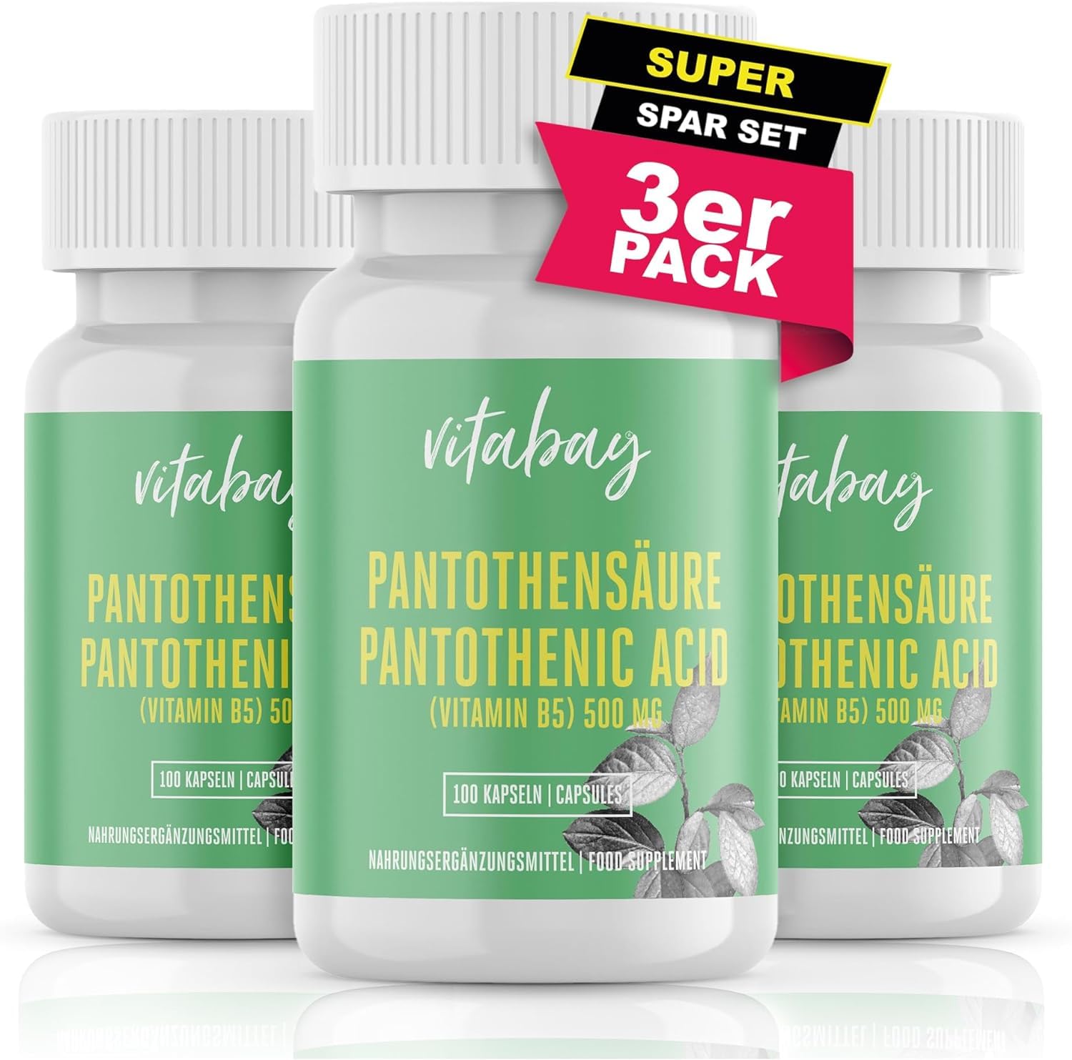 VITABAY Pantothenic acid 500 mg 300 vegan capsules (3 -series set) Pantothenic acid (vitamin B5) Highly dosed gastrointestinal resistant purely biologically made in Germany 100 pieces (3 -pack) vitamin B5