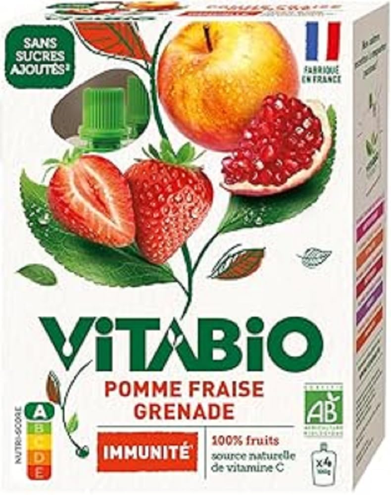 : Vitabio reveals the best that nature has to offer! Apple and strawberry combine with pomegranate and acerola for a delicious snack, a natural source of vitamin C. Natural support for your immune system! Ingredients: French apple 81 , strawberry 14 , pomegranate juice 6 , acerola 5 . From organic farming. Instructions: Once opened, the tightly closed pouch can be kept for 5 days in the refrigerator. See moreContains naturally occurring sugars. Made in France. 100 Fruit. No added sugars . Natural source of vitamin C. Vitabio reveals the best that nature has to offer!Description du produit Vitabio révèle ce que la nature a de meilleur à nous offrir ! La pomme et la fraise s'associent à la grenade et à l'acérola pour un encas gourmand, naturellement source de vitamine C. Un soutien naturel pour votre système immunitaire ! Ingrédients Pomme de France 81 , fraise 14 , jus de grenade 6 , acérola 5 . Issu de l'agriculture biologique P.when('A').execute(function(A) { A.on('a:expander:toggle_description:toggle:collapse', function(data) { window.scroll(0, data.expander. expander[0].offsetTop-100) }) }) Mode d'emploi Après ouverture, la gourde bien refermée se conserve 5 jours au réfrigérateur. Voir plusContient des sucres naturellement présents. Fabriqué en France. 100 Fruits. Sans sucres ajoutés . Source naturelle de vitamine C. Vitabio révèle ce que la nature a de meilleur à nous offrir !.VITABIO - Gourdes Pomme Fraise Grenade - IMMUNITE - 4x100g - BIO