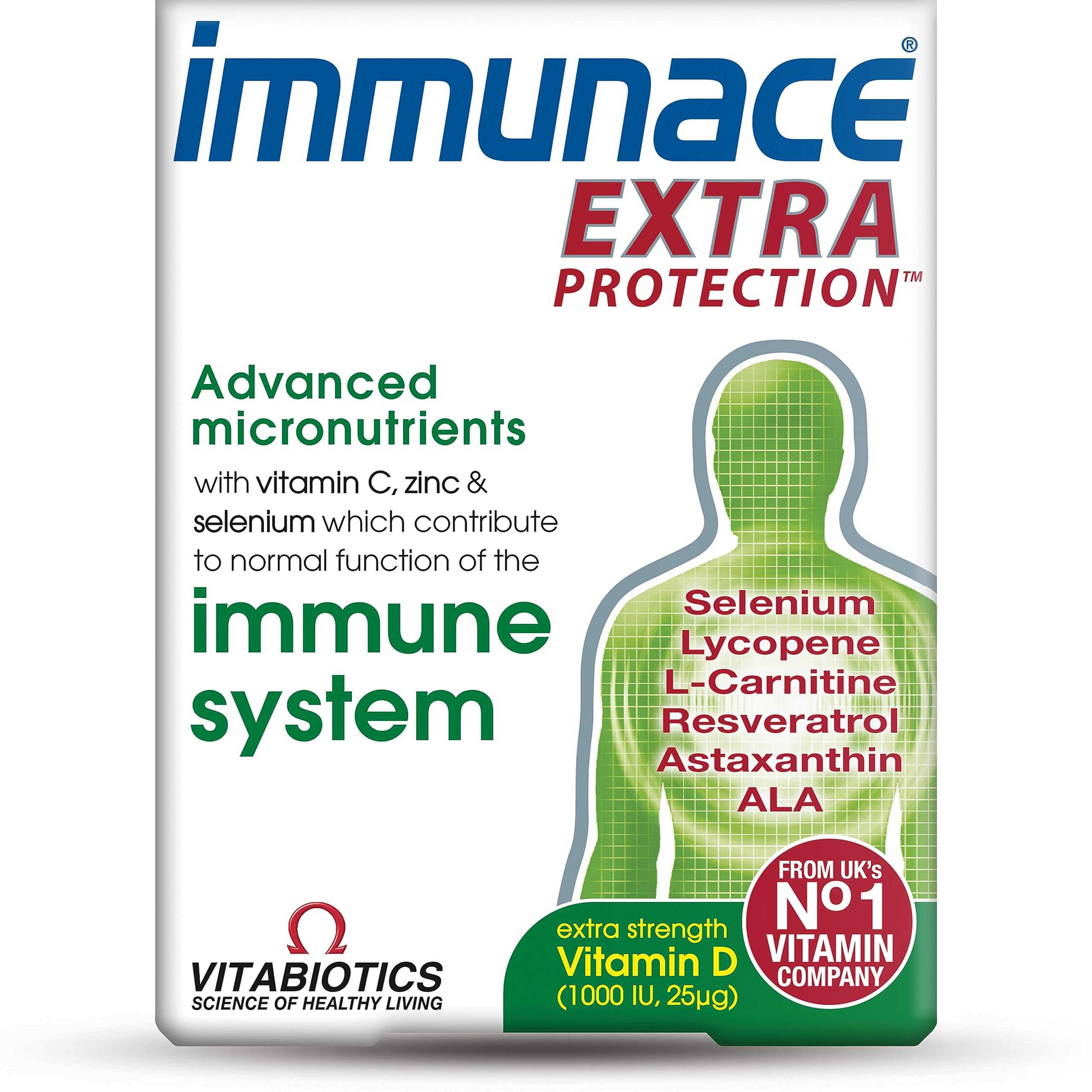 Immunace Extra Protection INGREDIENTS Tablet Ingredients: Vitamin C (Ascorbic Acid [Carrier: Hydroxypropylmethylcellulose]), Magnesium Hydroxide, Vitamin E (DL-Alpha Tocopheryl Acetate [Carriers: Silicon Dioxide Purified Talc]), Bulking Agents: Dibasic Calcium Phosphate Microcrystalline Cellulose, Citrus Bioflavonoids, Tablet Coating: (Hydroxypropylmethylcellulose, Propylene Glycol, Ethyl Cellulose, Hydroxypropylcellulose, Capric Triglyceride, Colours [Titanium Dioxide Iron Oxides]), Alpha Lipoic Acid, L-Cysteine, L-Carnitine Tartrate, Zinc Sulphate, Thiamin (Vitamin B1 as Mononitrate), Niacin (Nicotinamide), Anti-Caking Agents: Magnesium Stearate, Silicon Dioxide Purified Talc, Pantothenic Acid (as Calcium Salt), Polyvinylpyrrolidone, Grape Skin Flavonoids, Ferrous Fumarate, Polyvinylpolypyrrolidone, Astaxanthin, Betacarotene (Potato Starch, Water, Antioxidant: DL Alpha Tocopheryl Acetate), Vitamin B6 (Pyridoxine HCl), Vitamin A (Acetate [Carriers: Gum Acacia, Starch, Sucrose, Tricalcium phosphate, Antioxidant: DL-Alpha Tocopherol]), Potato Starch, Riboflavin, Manganese Sulphate, Ethyl Cellulose, Lycopene, Vitamin B12 (Cyanocobalamin [Carrier: Dicalcium Phosphate]), Vitamin D3 (Cholecalciferol [Carriers: Medium Chain Triglycerides, Colloidal Silica, Talc, Maltodextrin, Butylated Hydroxyanisole Ethylcellulose]), Copper Sulphate, Vitamin K1 (Phytomenadione [Carriers: Acacia Gum, Glucose Syrup, Tricalcium Phosphate]), Chromium Trichloride, Folic Acid (as Pteroylmonoglutamic Acid), Sodium Selenate, Potassium Iodide. Allergy Advice: For allergens, see ingredients in bold. DIRECTIONS One tablet per day with your main meal SAFETY WARNING Do not exceed the recommended intake. Only to be taken on a full stomach BOX CONTAINS 30 Tablets MANUFACTURER CONTACT INFORMATION Vitabiotics Ltd, 1 Apsley Way, London NW2 7HF, United KingdomScience of healthy living. Free from yeast. Immunance extra protection tabs 30's. Free from artificial preservatives. Free from artificial colours.