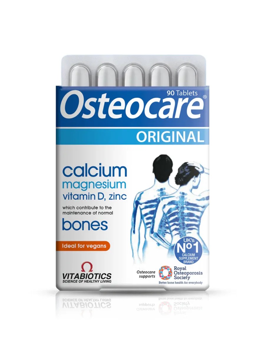 Osteocare Original 90 tablets contains a special formula with calcium, magnesium, zinc, and vitamin D3, which are essential for strong bones. Vitamin D3 helps the body better absorb calcium.