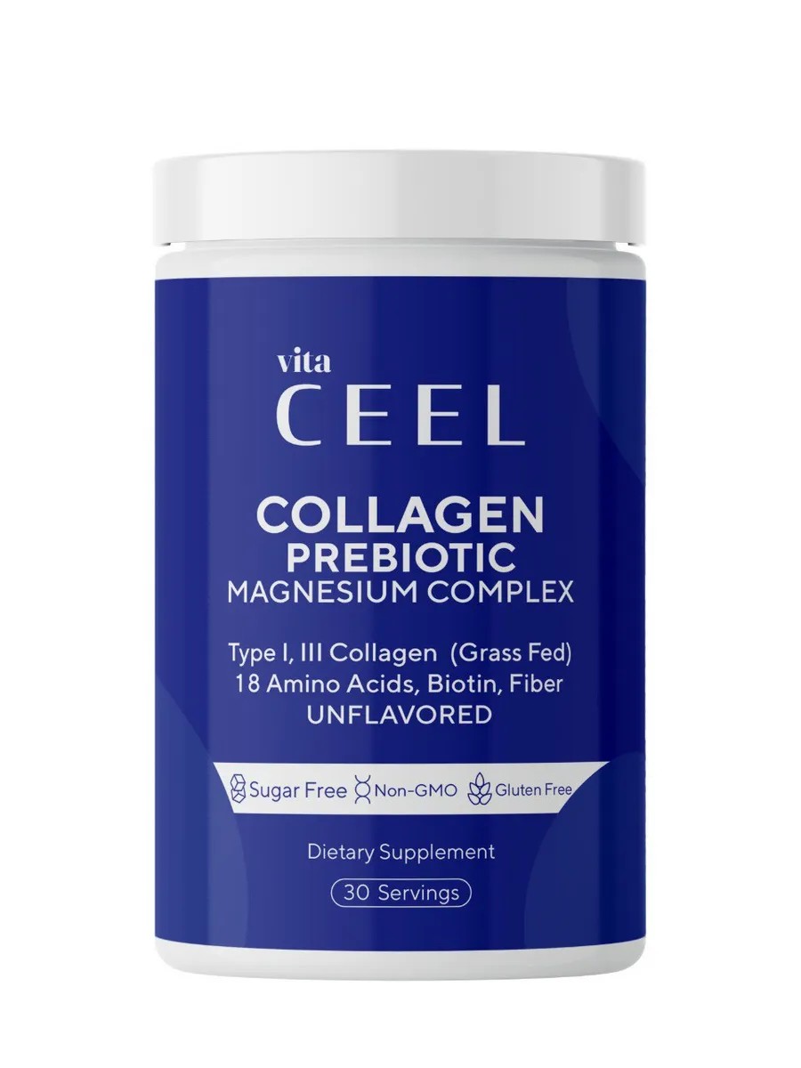 The formula includes collagen types 1 and 3, magnesium complex, biotin, fiber, protein and B vitamins (B5, B6, B12).