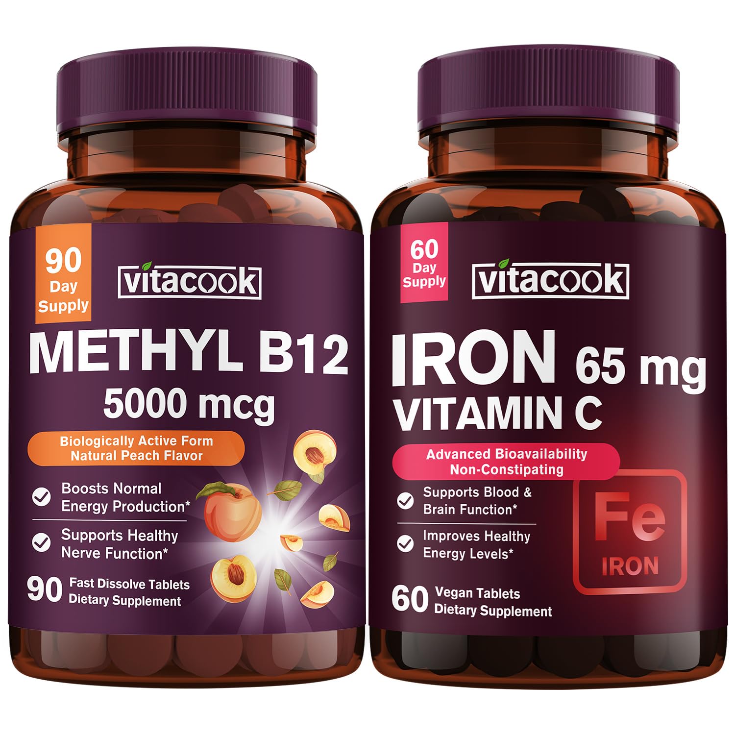 Vitacook Vitamin B12 and Iron Bundle offers an ideal combination to meet your body's essential nutrient requirements. Our Vitamin B12 is packed with 5000 mcg of methylcobalamin, which is the most natural, active, bioavailable coenzyme form of B12, ensuring optimal absorption. These tablets are sugar-free, pleasantly peach-flavored, and dissolve rapidly in your mouth. As for our Iron, it contains carbonyl iron known for its exceptional purity and bioavailability. Each tablet is carefully formulated with 65 mg of elemental iron and 250 mg of vitamin C to enhance absorption. With just one easy-to-swallow tablet per day, you can replenish your iron levels and combat iron deficiency. These supplements can be taken conveniently at any time and place. Why Choose Us? B12: 5000 mcg of Methylcobalamin B12 The Most Bioactive Form for Superior Absorption Especially Suitable for Vegans Fast Dissolving Natural Peach Flavor Sugar-Free Non GMO Iron: 65 mg of Elemental Iron Highly Pure and Gentle Form of Iron Vegan and Non-GMO Fortified with Vitamin C to Boost Absorption Once Daily Easy to Swallow What Are the Benefits? Fuels Energy Production Promotes Nervous System Health Supports Red Blood Cell Function Helps Maintain Energy Utilization Enhances Muscle Function Promotes the Immune System Products You Can Trust All our products are non-GMO and do not contain gluten, soy, milk, eggs, fish, shellfish, wheat, peanuts, artificial flavors, unnecessary binders, or preservatives. Lab Tested Made in USA Lab tested for purity and quality and made in USA in a GMP-audited facility. Our Mission Our mission is to deliver the highest quality dietary supplements for you and your loved ones to live happier and richer lives.Our Mission: We aim to deliver the highest quality dietary supplements for you and your loved ones. Our dedication to quality and purity has made our products exceptional and unparalleled. Our mission is to provide you with top-quality dietary supplements to help you and your family achieve your health goals. . Pure Exceptional Products: Our supplements are made with pure, plant-based ingredients and backed by intensive scientific research to support your energy, health, and well-being. They are non-GMO and do not contain gluten, dairy, soy, artificial colors, and preservatives. All Vitacook products are lab tested for purity and quality and made in USA in a GMP-audited facility. We take our time to provide the best nutritional supplements possible for you and your family. High Potency Iron, Gentle on the Stomach: Our formula contains carbonyl iron, renowned for its exceptional purity and bioavailability. Vitacook Iron with Vitamin C is vegan friendly, and each tablet is formulated with 65 mg of elemental iron and 250 mg of vitamin C. Bioactive Methyl B12, Sugar Free, FDT with Natural Peach Flavor: Vitacook B12 is sourced from natural methylcobalamin, distinguishing it from synthetic cyanocobalamin. Methyl is the most bioactive form of B12, ensuring superior absorption and retention in the body. Our sugar-free, fast-dissolving tablets with natural peach flavor provide 5000 mcg of methylcobalamin, ideal for vegans, vegetarians, and those prone to vitamin B12 deficiency. Your Energy Combo : This carefully curated bundle combines the power of two essential nutrients to support your body's energy production, immune system function, and overall well-being. Iron plays a crucial role in the production of red blood cells, which transport oxygen throughout your body. Vitamin B12 is another vital nutrient that promotes energy production and supports nerve cell function. .