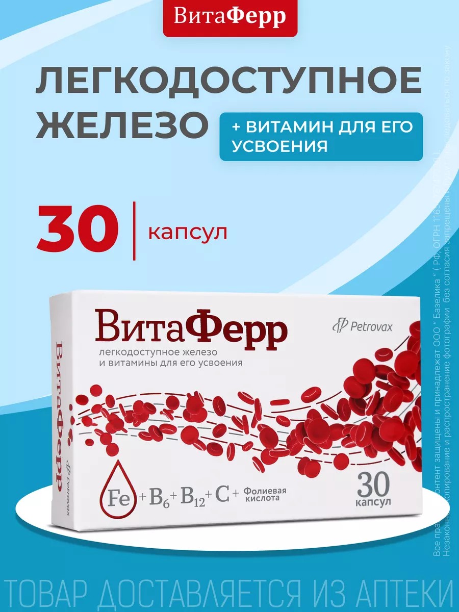 To support iron levels in the body, a new complex, VitaFerr, has been developed. It contains readily available iron and vitamins that enhance its absorption. A special component of the complex, iron bisglycinate, offers high bioavailability compared to traditional forms of iron. Iron in bisglycinate form is also gentler on the gastrointestinal tract, which is especially important for restoring normal iron levels. Additionally, the complex contains B vitamins and ascorbic acid, which enhance iron absorption. VitaFerr is easy to use: just one capsule daily for 30 days. The course can be repeated if necessary. The amount in one capsule: iron 30 mg, vitamin C 70 mg, vitamin B6 0.7 mcg, vitamin B12 1.25 mcg, folic acid 400 mcg. iron / iron dietary supplement / iron vitamins / vitamins iron for women / vitamin iron / vitamins with iron / iron bisglycinate / iron bisglycinate / anemia / iron bisglycinate / health / women's health / vitamins iron for women / vitamins for women / women's vitamins /