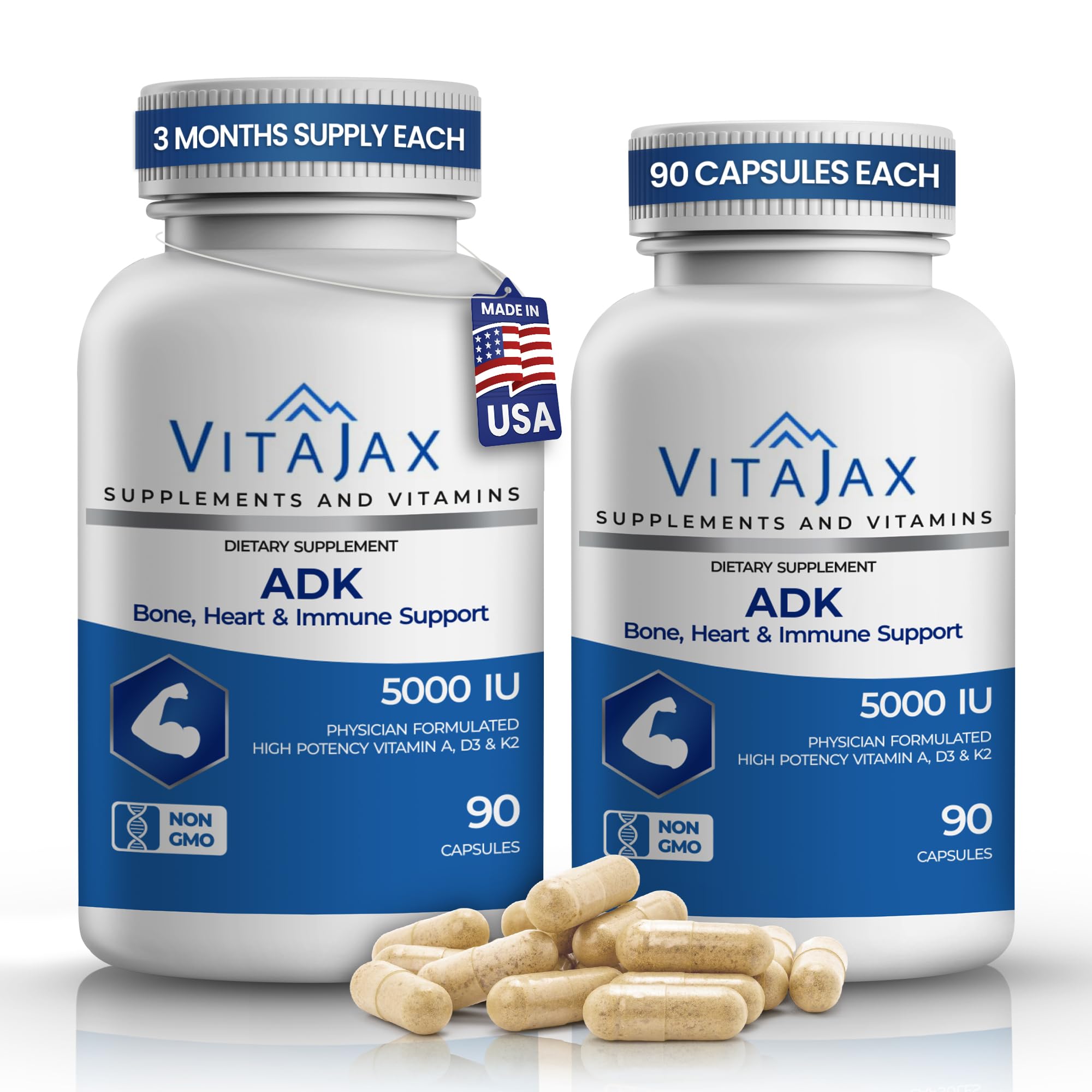 6-MONTH SUPPLY FOR DAILY CONVENIENCE – Each bottle contains 90 easy-to-swallow capsules, providing a full three-month supply to to maintain your daily ADK vitamin intake as part of a balanced lifestyle with Vitamin ADK Vitamin Supplement. CLEAN, SAFE HIGH-QUALITY FORMULA – Made in USA with non-GMO, gluten-free ingredients and without artificial colors or preservatives. Manufactured under strict quality standards and 3rd party tested to ensure purity, safety, and consistent potency. VITAMIN A FOR DAILY WELLNESS SUPPORTS – Vitamin A (5,000 IU) contributes to normal vision, skin health, and immune system support, making this blend a valuable addition to your everyday nutrition routine. SUPPORTS BONE STRENGTH CALCIUM BALANCE – Vitamin D3 (5,000 IU) supports calcium absorption, while Vitamin K2 as MK-7 (500mcg) works synergistically to support proper calcium utilization in the body, helping maintain strong bones and overall structural support. HIGH POTENCY ADK FORMULA (5000 IU) – VITAJAX ADK Vitamin Supplement delivers a carefully balanced combination of Vitamins A, D3, and K2 (MK-7) in every serving, doctor designed to support daily nutritional intake with a high-potency blend.