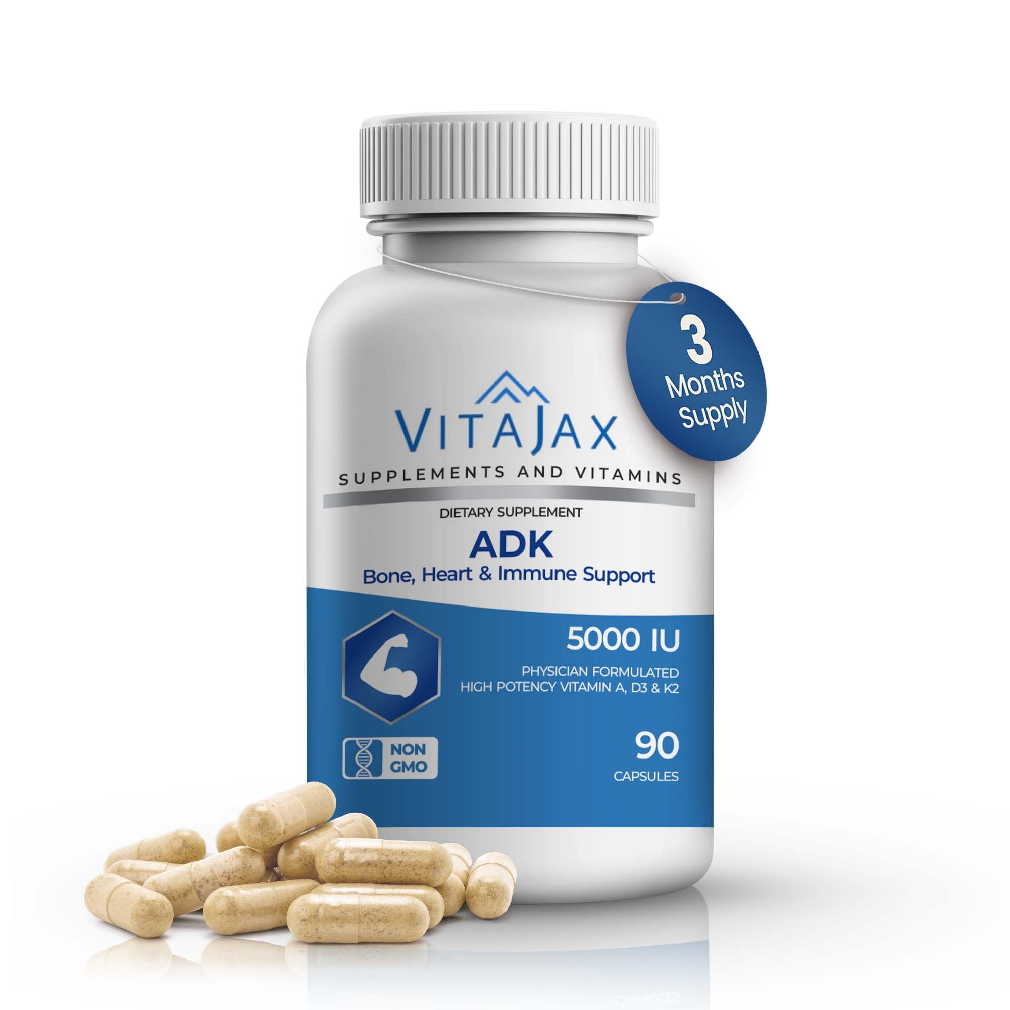 VITAJAX, ADK - Vitamin ADK Supplement, 90 Capsules - High Potency Vitamin A, D3 (5,000 IU) K2 as MK-7 for Bone, Heart & Calcium Absorption Non-GMO, Gluten Free (3 Month Supply)