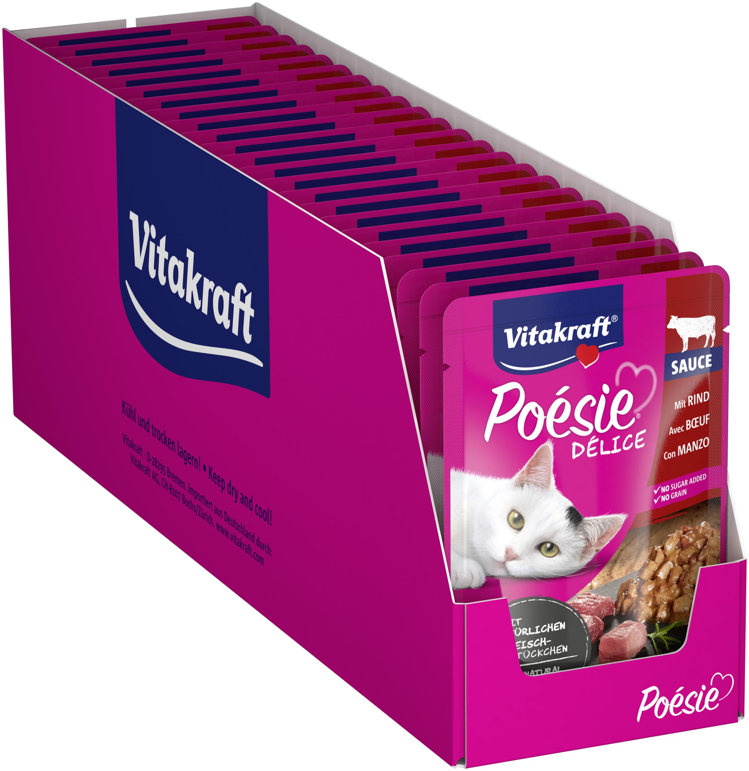 Treat your cat to a moment of pure happiness with Vitakraft Poésie Délice. This high-quality, meat-rich wet food is specially prepared to meet the nutritional needs of your feline companion. Enriched with natural ingredients, it is sugar-free, grain-free, and free of artificial flavors or colors, to guarantee an authentic taste and healthy nutrition. Perfectly portioned in a resealable bag, each portion stays fresh and tasty. INGREDIENTS poultry meat, pork liver, poultry liver, 10 beef, pork plasma, potato starch, sodium tripolyphosphate The total meat and animal by-product content is 55 and the proportion of muscle meat is 40 . BOX CONTENTS Pack of 23 pouches FOR THE LOVE OF ANIMALS: Since 1837, we have been supporting you every day by offering food, hygiene products and accessories that respect the unique needs of each pet. CONVENIENT PORTION AND GUARANTEED FRESHNESS: Presented in an 85g pouch, this wet food is easy to serve and keeps well thanks to its resealable packaging. FORMULA WITHOUT ARTIFICIAL INGREDIENTS: This wet meal has no added sugars, no grains, and no artificial colors or preservatives, for a healthy and natural diet. TASTY AND IRRESISTIBLE: Each bite contains chunks of beef in a fine sauce, offering a rich and delicious taste experience for your cat. Offrez à votre chat un pur moment de bonheur avec Vitakraft Poésie Délice. Cette nourriture humide de haute qualité et riche en viandes est spécialement préparée pour satisfaire les besoins nutritionnels de votre compagnon félin. Enrichie d'ingrédients naturels, elle est sans sucres, sans céréales, et sans arômes ou colorants artificiels, pour garantir un goût authentique et une alimentation saine. Parfaitement dosée dans un sachet refermable, chaque portion reste fraîche et savoureuse. INGRÉDIENTS viande de volaille, foie de porc, foie de volaille, 10 boeuf, plasma de porc, fécule de pomme de terre, tripolyphosphate de sodium La teneur totale en viande et sous-produits animaux est de 55 et la proportion de viande musculaire est de 40 . CONTENU DU COFFRET Lot de 23 sachets POUR L'AMOUR DES ANIMAUX : Depuis 1837, nous vous accompagnons au quotidien en vous proposant une alimentation, des produits d'hygiène et des accessoires qui respectent les besoins singuliers de chaque animal domestique. PORTION PRATIQUE ET FRAÎCHEUR GARANTIE : Présentée dans un sachet de 85g, cette nourriture humide est facile à servir et se conserve bien grâce à son emballage refermable. FORMULE SANS INGREDIENTS ARTIFICIELS : Ce repas humide est sans sucres ajoutés, sans céréales, ni colorants ou conservateurs artificiels, pour une alimentation saine et naturelle. SAVOUREUSE ET IRRÉSISTIBLE : Chaque bouchée contient des morceaux de bœuf dans une sauce fine, offrant une expérience gustative riche et délicieuse pour votre chat.