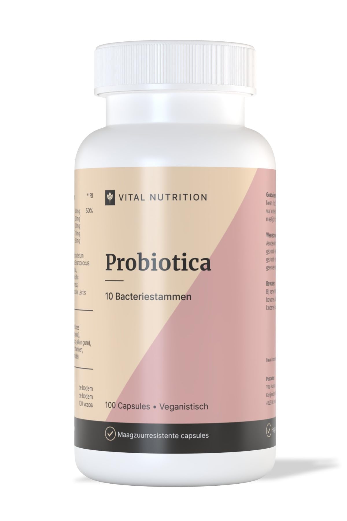 Vital Nutrition Probiotics contain a high amount of 9.6 billion colony forming units (CFU) and a diversity of 10 effective bacterial strains per capsule, which are stomach acid resistant so they actually reach the intestine. The addition of L-glutamine and vitamin C enrich the formula. Supplemented with DigeZyme enzyme complex and prebiotic fibers (FOS) that serve as a nutritional source for the probiotics. INGREDIENTS Probiotic blend FOS (fructo-oligo-saccharide) DigeZyme L-glutamine Vitamin C (Ascorbic Acid)Vital Nutrition carries out an extensive risk analysis on all its products and, where necessary, has batches independently tested by Eurofins for relevant parameters, such as heavy metals, PAH4 and mycotoxins, with fully transparent laboratory reports that are accessible. Produced in the Netherlands with advanced pharma-grade equipment, completely energy neutral thanks to our own solar panels, according to HACCP-certified processes and packaged under strict hygienic conditions. Free from gluten, lactose and GMOs and suitable for both vegetarians and vegans. Supplemented with vitamin C, L-glutamine, prebiotic fibers (FOS) and the patented enzyme complex DigeZyme for a complete composition. Contains 10 carefully selected bacterial strains with 9.6 billion CFU per daily dose, in stomach acid-resistant capsules that reach the intestines.Probiotica - 10 Bacteriestammen en 9.6 Miljard KVE, Spijsverteringsenzymen Prebiotica, Vegan, Maagzuurresistent - 60 Capsules Vital Nutrition Probiotica bevat een hoge hoeveelheid van 9,6 miljard kolonievormende eenheden (KVE) en een diversiteit van 10 effectieve bacteriestammen per capsule, die maagzuurresistent zijn waardoor ze de darm ook daadwerkelijk bereiken. De toevoeging van L-glutamine en vitamine C verrijken de formule. Aangevuld met DigeZyme enzymencomplex en prebiotische vezels (FOS) die dienen als voedingsbron voor de probiotica. INGREDIËNTEN Probiotische blend FOS (fructo-oligo-saccharide) DigeZyme L-glutamine Vitamine C (Ascorbinezuur)Vital Nutrition voert op al haar producten een uitgebreide risicoanalyse uit en laat waar nodig batches onafhankelijk testen door Eurofins op relevante parameters, zoals onder andere zware metalen, PAK4 en mycotoxines, met volledig transparante laboratoriumrapporten die inzichtelijk zijn. Geproduceerd in Nederland met geavanceerde pharma-grade apparatuur, volledig energieneutraal dankzij eigen zonnepanelen, volgens HACCP-gecertificeerde processen en verpakt onder strikt hygiënische omstandigheden. Vrij van gluten, lactose en GMO's en geschikt voor zowel vegetariërs als veganisten. Aangevuld met vitamine C, L-glutamine, prebiotische vezels (FOS) en het gepatenteerde enzymencomplex DigeZyme voor een complete samenstelling. Bevat 10 zorgvuldig geselecteerde bacteriestammen met 9,6 miljard KVE per dagdosering, in maagzuurresistente capsules die de darmen bereiken.