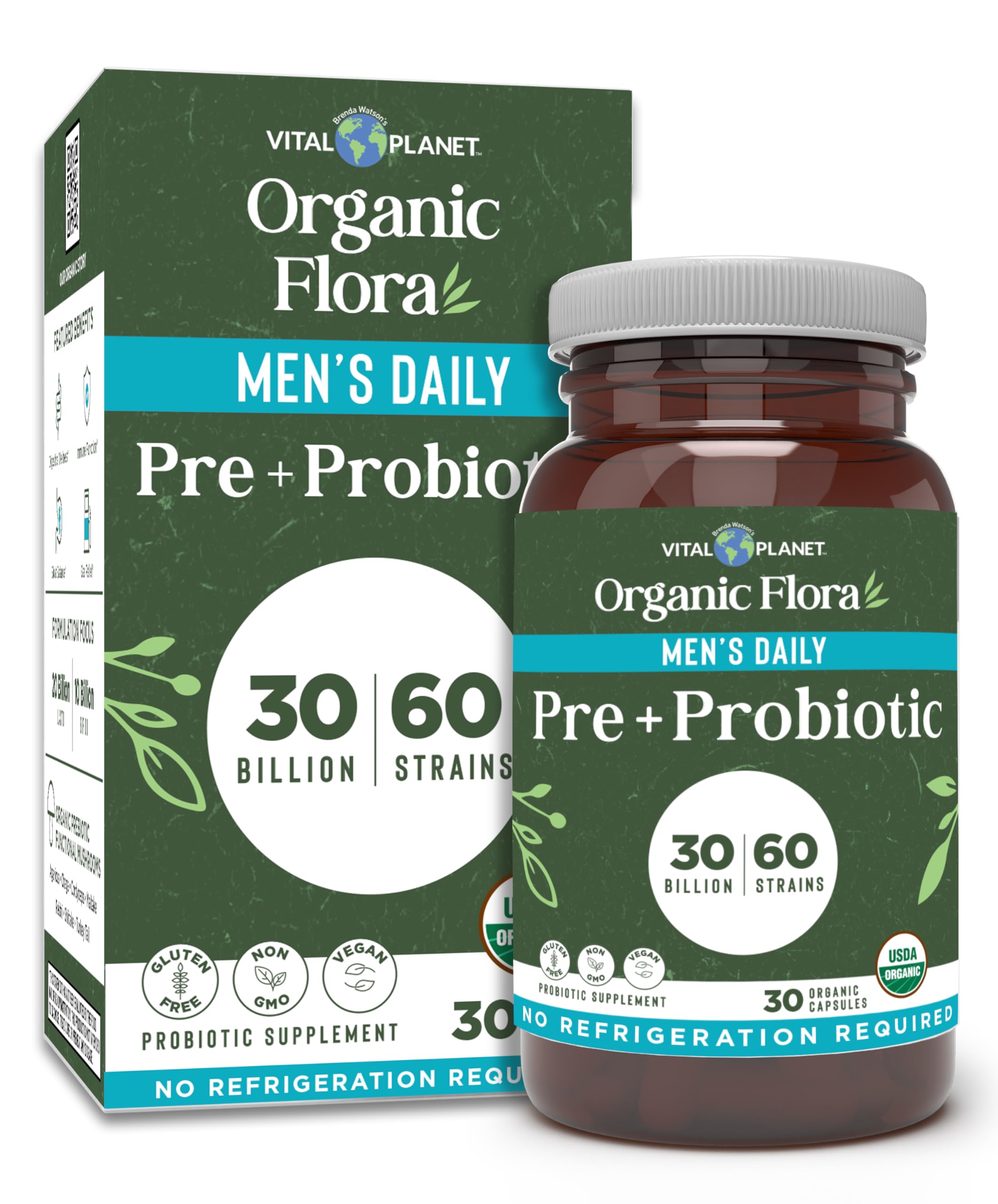 Vital Planet - Organic Flora Probiotics for Men Men's Daily Shelf Stable Probiotic 30 Billion CFU 60 Diverse Strains Prebiotic Organic Mushroom Blend Immune and Digestive Health 30 Capsules