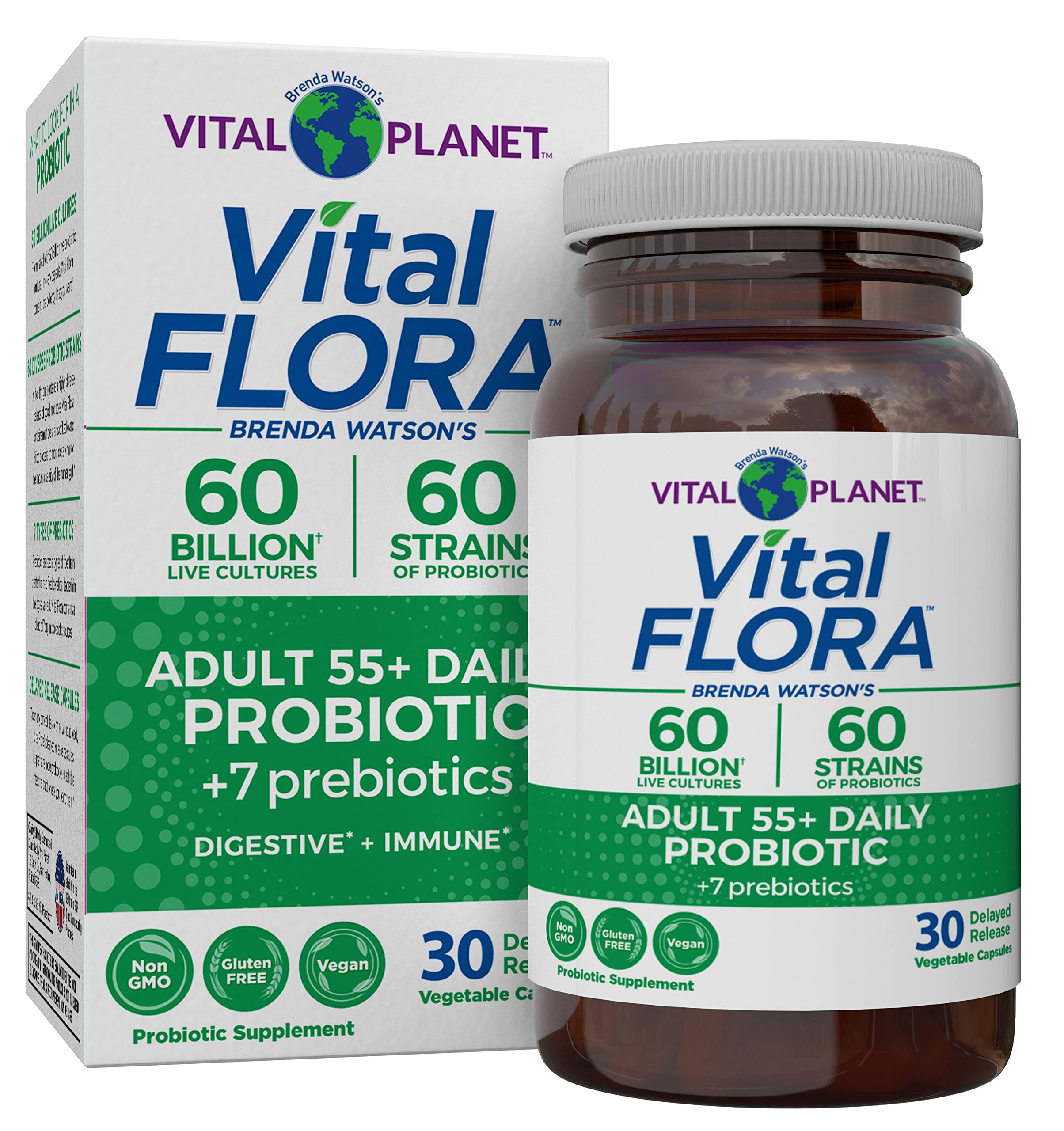 Quality, Purity and Potency Standards - Vegan, non-GMO, dairy free, soy free gluten free. Made with safe clean ingredients with no unnatural binders, fillers, or artificial ingredients. We formulate to meet or exceed labeled potency through expiration and third-party certify our products for purity potency. Changes in temperature during normal shipping (even in warmer months climates) have not been found to impact the viability of the product. Refrigerate after opening. Expertly Formulated - Vital Planet founder Brenda Watson and her team of digestive care experts and scientists have been successfully formulating high potency, highly diverse probiotics for decades using the latest microbiome research discoveries to guide them. To help ensure the probiotics reach the intestinal tract where you want them, we use delayed release vegetable capsules specially designed to resist stomach acid. Prebiotics – Food for Probiotics - Prebiotics are plant-based fibers that help feed good probiotics in the gut. But not all probiotics like the same food source. That's why Vital Flora contains a diverse blend of 7 different organic whole food prebiotics. Diversity Matters - A healthy gut contains a highly diverse balance of good probiotics. To more closely match this natural diversity, Vital Flora probiotics contain 60 different Lacto and Bifido strains. Our Adult 55 Daily formula contains more replenishing, colon-friendly Bifidobacteria known to naturally decline with age. Premium Probiotic for Men and Women Over 55 - Vital Flora Adult 55 Daily Probiotic is a high quality, potent one-capsule-a-day formula with 60 Billion live cultures (CFU) from 60 beneficial, clinically-studied Bifido and Lacto strains plus 7 organic prebiotics. Our optimally balanced, complete daily probiotic has a higher ratio diversity of targeted Bifidobacteria strains to support your needs after 50 – digestive and immune health including occasional constipation, diarrhea, gas bloating.